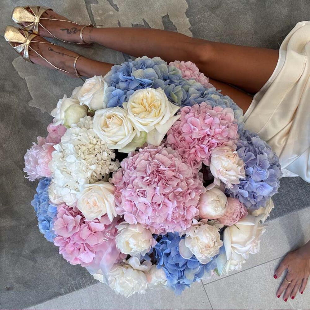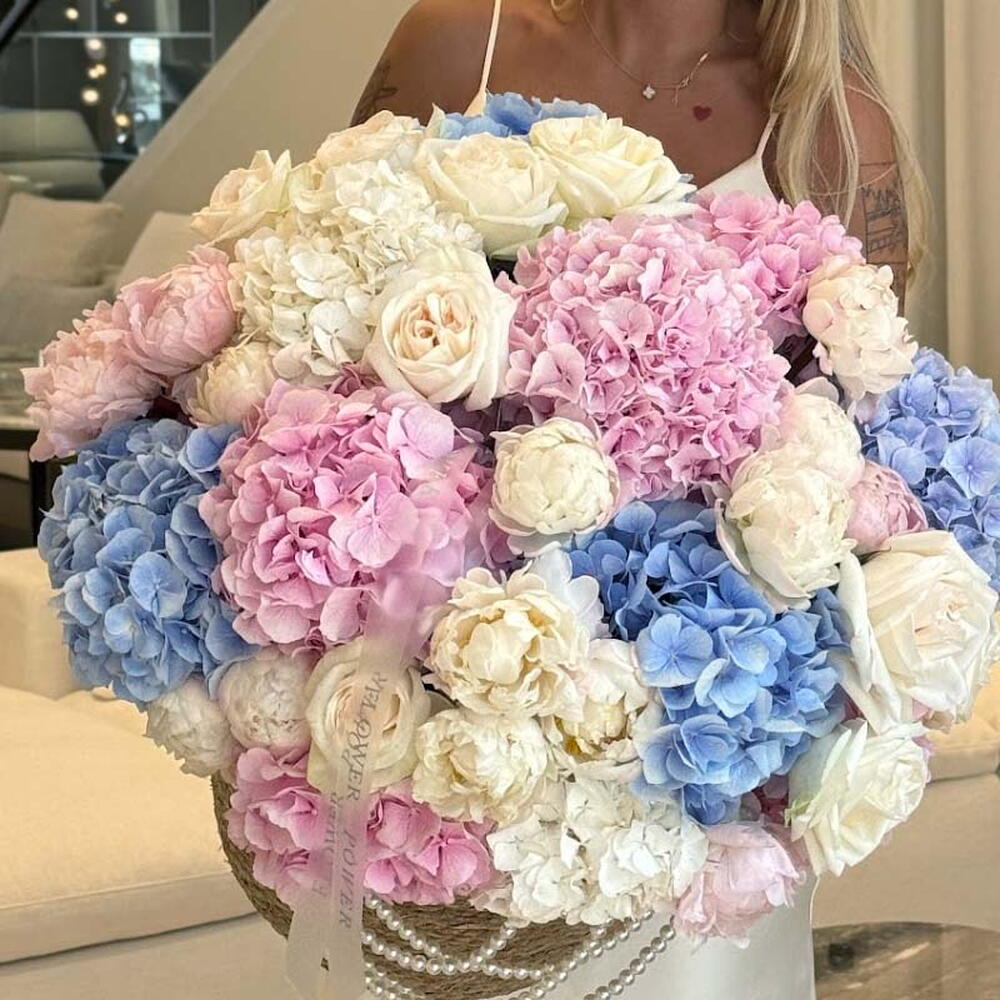 Пастельная мечта: большая корзина розовых, белых и голубых гортензий, роз и пионов