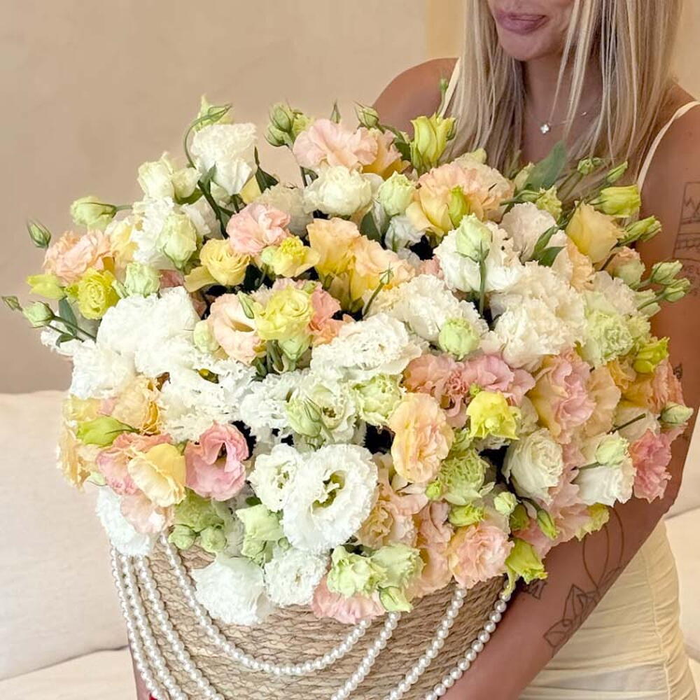 Пастельный шепот: Большая корзина кремовых, нежно-розовых и персиковых эустом 75 стеблей