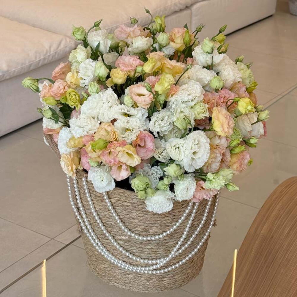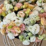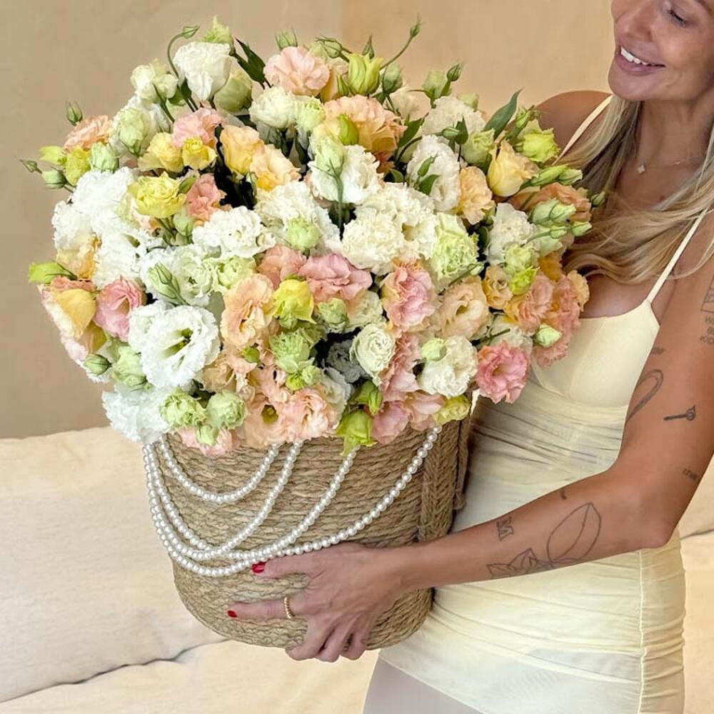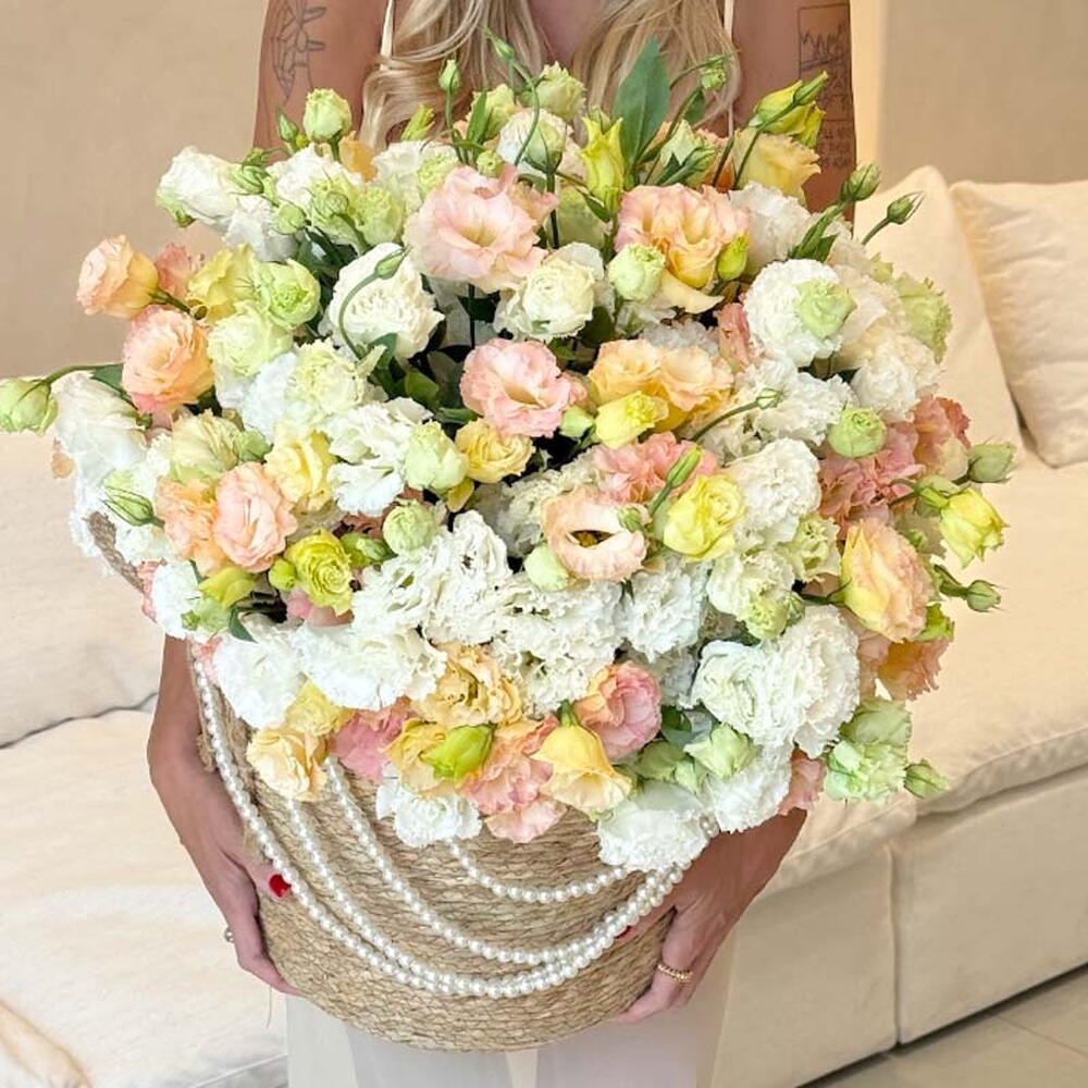 Объёмная и изысканная композиция из свежей эустомы в нежных пастельных тонах (кремовый, нежно-розовый, персиковый и зелёный) в плетёной корзине из натурального материала. Этот дизайн воплощает современную роскошь и прибрежный гламур. Он идеально подходит для изысканного домашнего декора, дня рождения или в качестве элегантного подарка тем, кто ценит сдержанную роскошь. Большой размер — 75 эустом