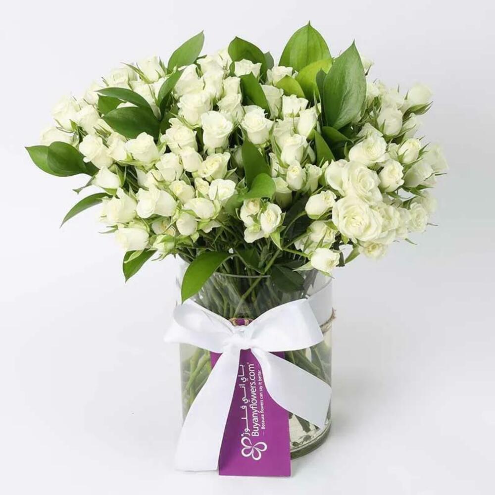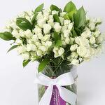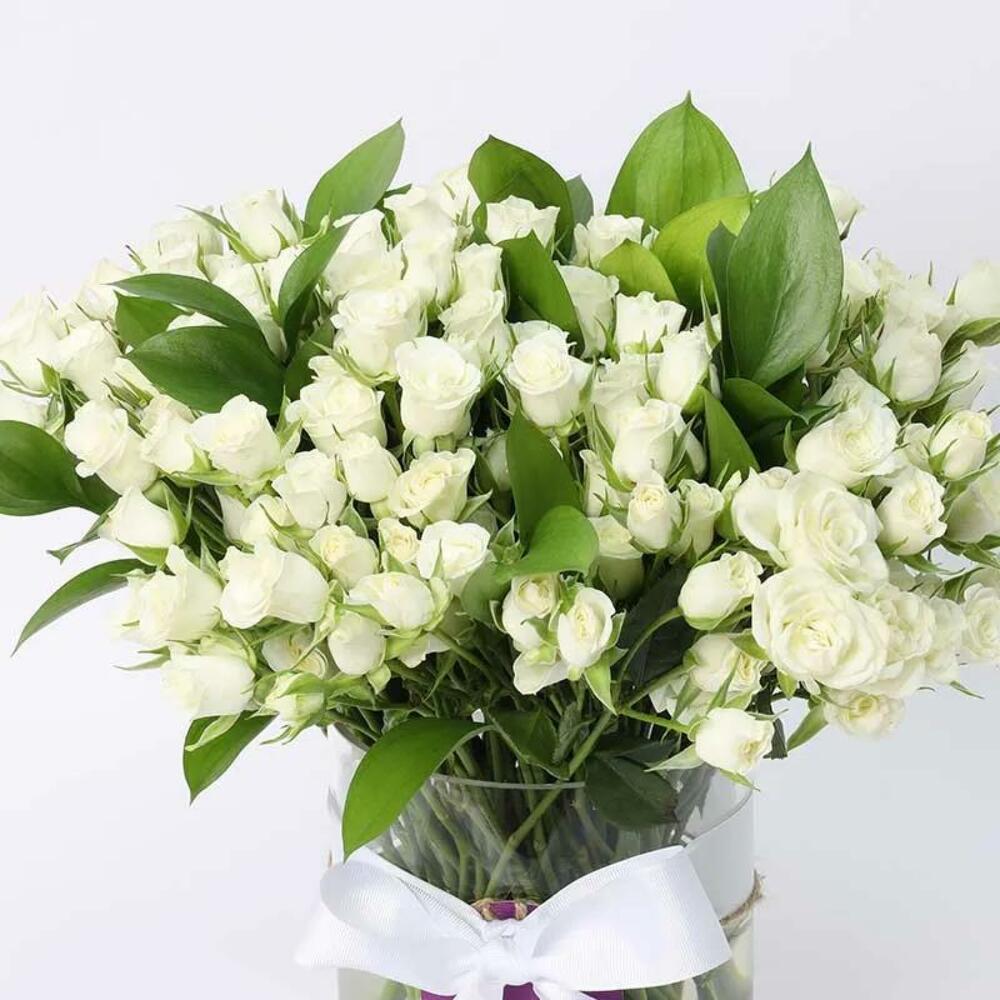 white spray rose - 51 шт. одиночные стебли рускуса - 5 шт. цилиндрическая ваза и перевязано белым ленточным бантом - 1 шт.