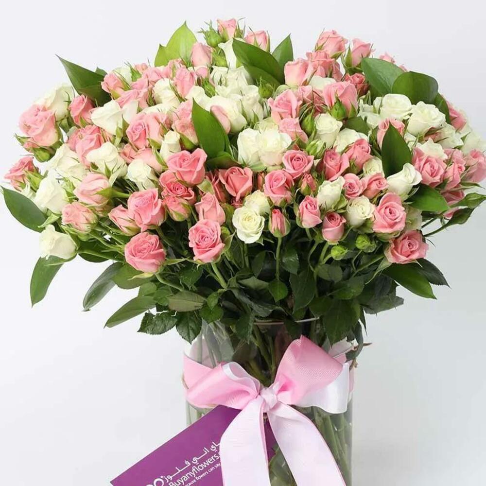 25 белых кустовых роз 26 стеблей розовых кустовых роз 5 стеблей простого рускуса "В цилиндрической вазе" Розовый бант из ленты