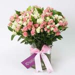 white spray rose - 25 шт. одиночные стебли рускуса - 5 шт. стебли розовых кустовых роз - 26 шт. ваза-цилиндр, перевязанная розовой лентой в бант - 1 шт.
