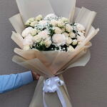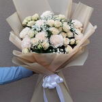 Мягкий, нежный и совершенно очаровательный — букет «Шепот персика» — это празднование тонкой красоты и изящества. В нём сочетается воздушная смесь кремовых роз, персиковых гвоздик и ноток лавандовых цветов, композиция завернута в роскошную металлическую бумагу и перевязана лентой цвета слоновой кости. Пастельные тона вызывают чувства умиротворения, тепла и вечной элегантности. Идеален для дней рождения, юбилеев или искренних извинений — этот букет приносит нежную нотку любви в любой повод. Каждый цветок тщательно отобран и размещён так, чтобы впечатлять и свежестью, и изяществом. Пусть этот букет станет вашим шёпотом привязанности и признательности.