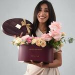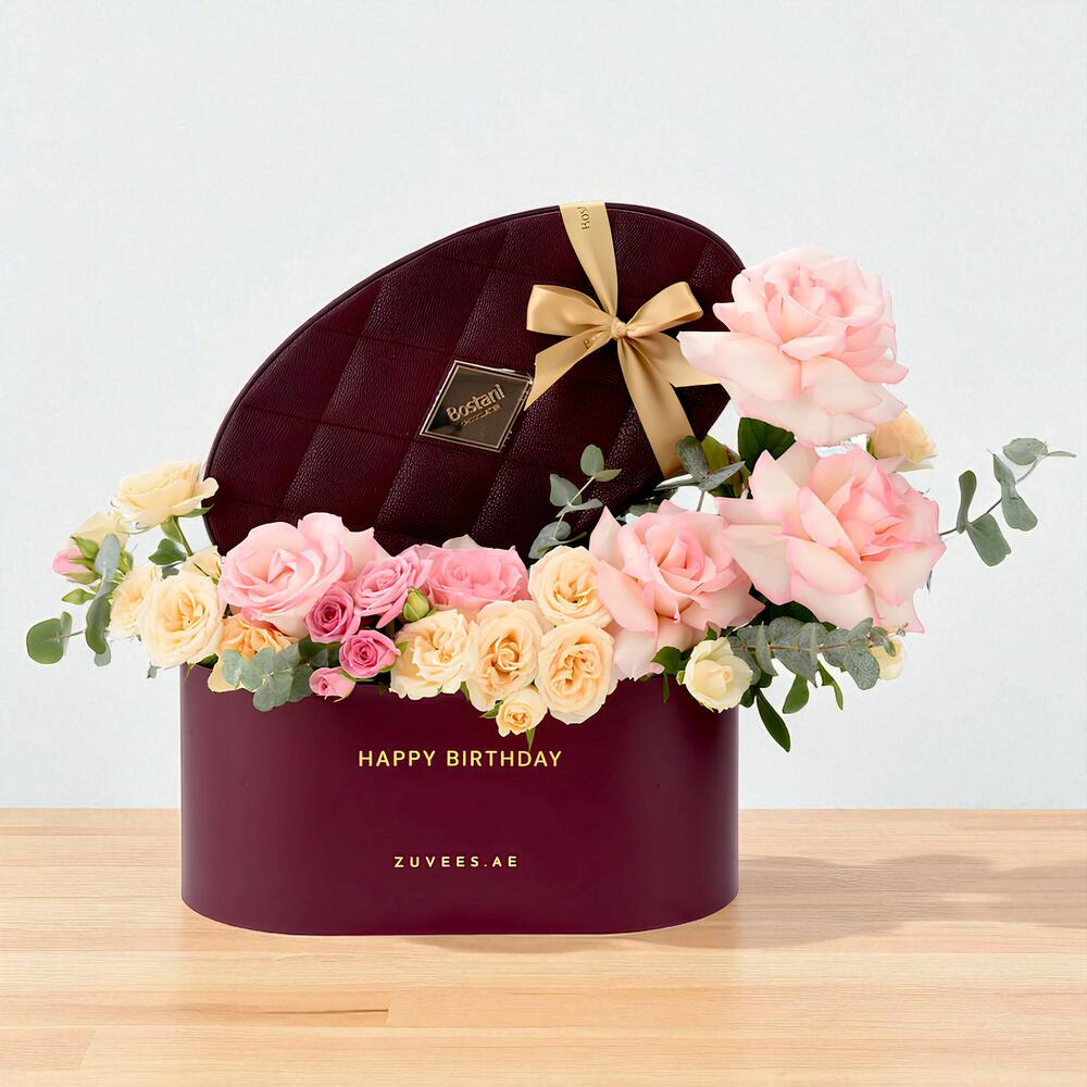 В роскошной фирменной овальной коробке ZUVEES размера Large с надписью “Happy Birthday” эта композиция в мягкой, романтичной палитре включает 4 розы сорта Esperance, 3 персиковые кустовые розы, 2 розовые кустовые розы и 2 веточки эвкалипта. В паре с изысканной шоколадной коробкой Bostani Hazel Leathered (Small) этот подарок добавляет вкусную нотку и без того очаровательному цветочному жесту.