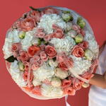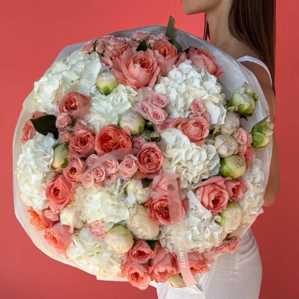 Персиковое облако: букет большого размера из гортензий, пионов, кустовых роз и садовых роз