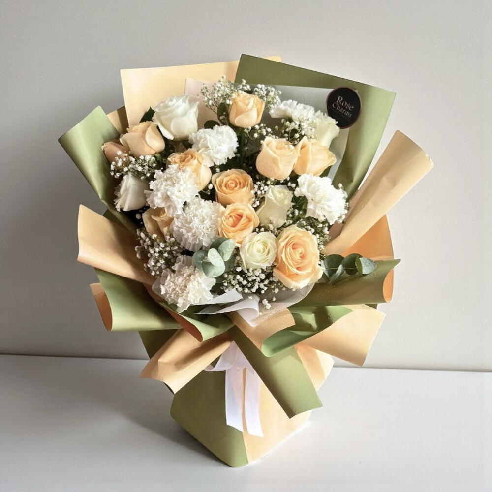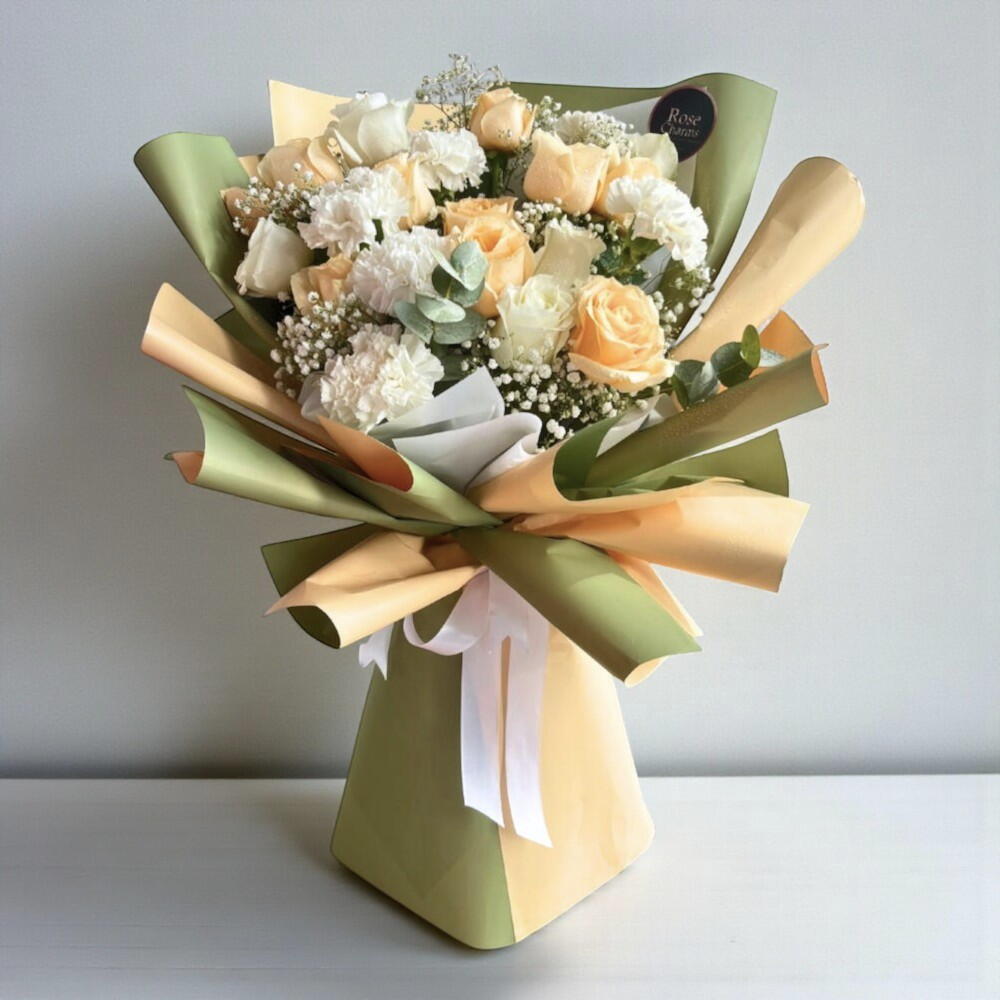 Букет Персиковая гармония | 11 персиковых роз, 5 белых роз 5 гвоздик | Доставка по Дубаю