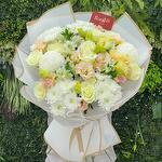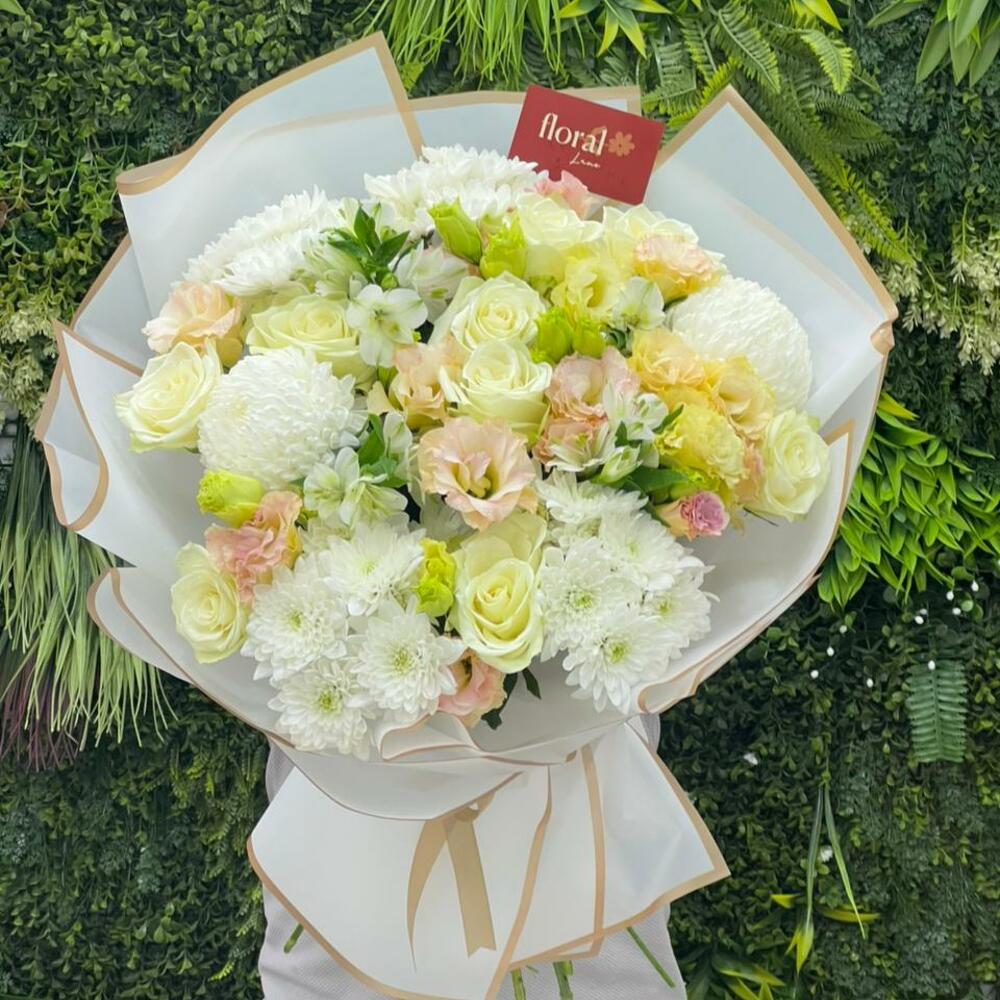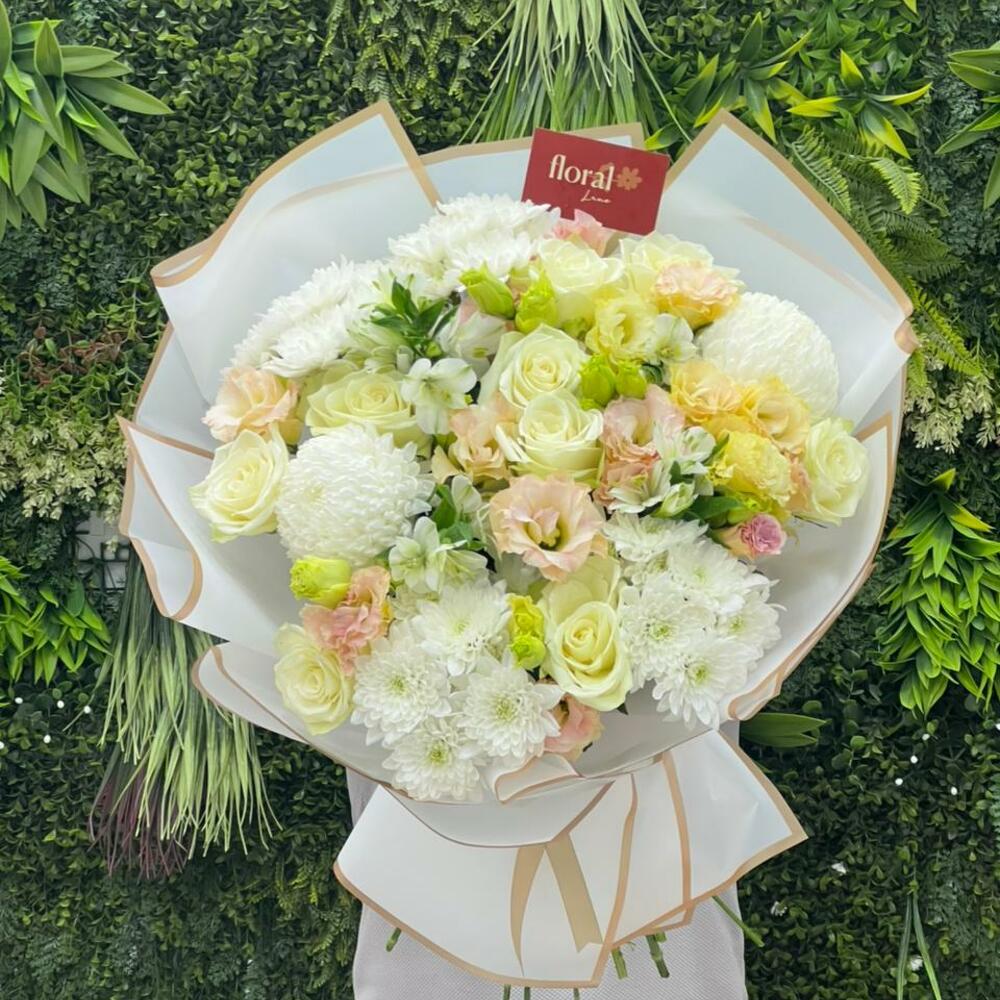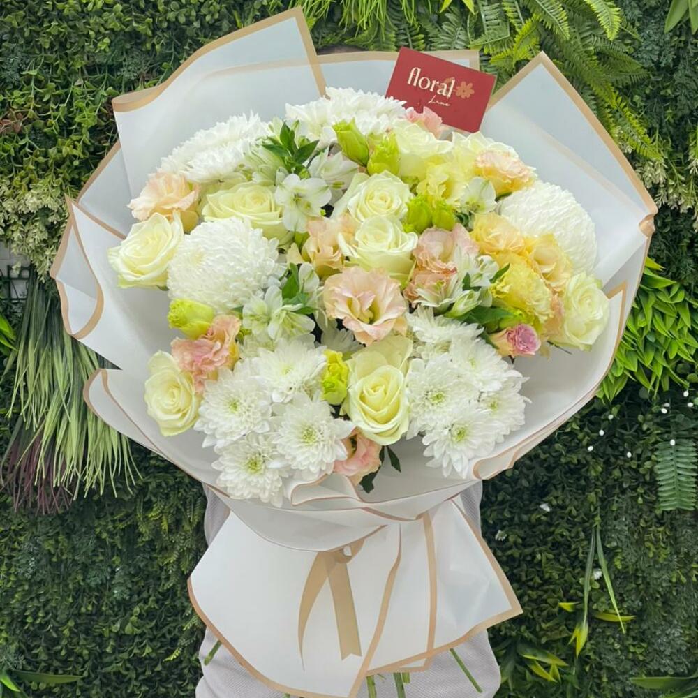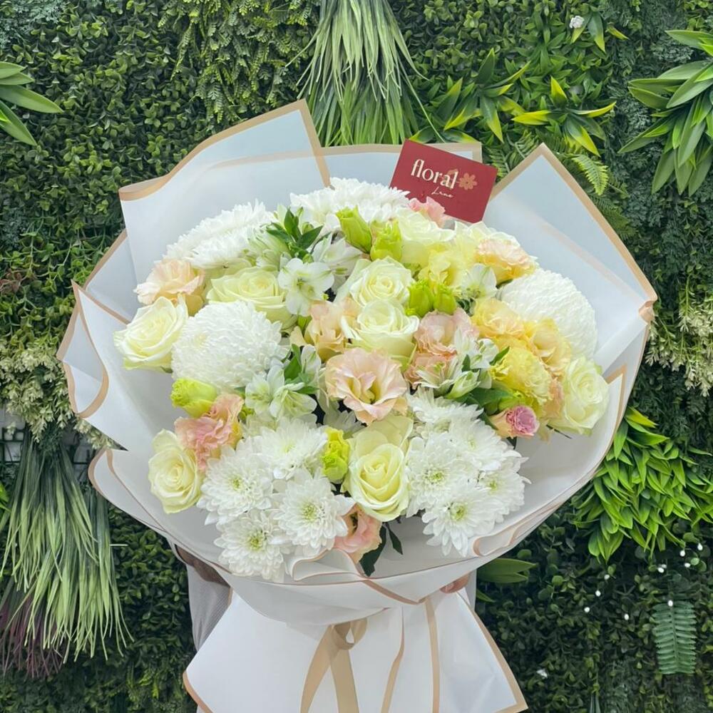 white chrysanthemums - 6 шт. white roses - 9 шт. персиковая эустома - 8 шт.