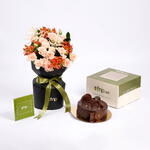 3 кустовые розы персикового цвета Sweet Sara, 3 оранжевые альстромерии, 2 белых астильбы (наполнитель из асафетиды), 1 черная упаковочная бумага на бумажной основе, зеленый наполнитель из рускуса, 2 зеленые шелковистые ленты с логотипом FNP, 1 джутовая проволока, 1 торт (полкг)