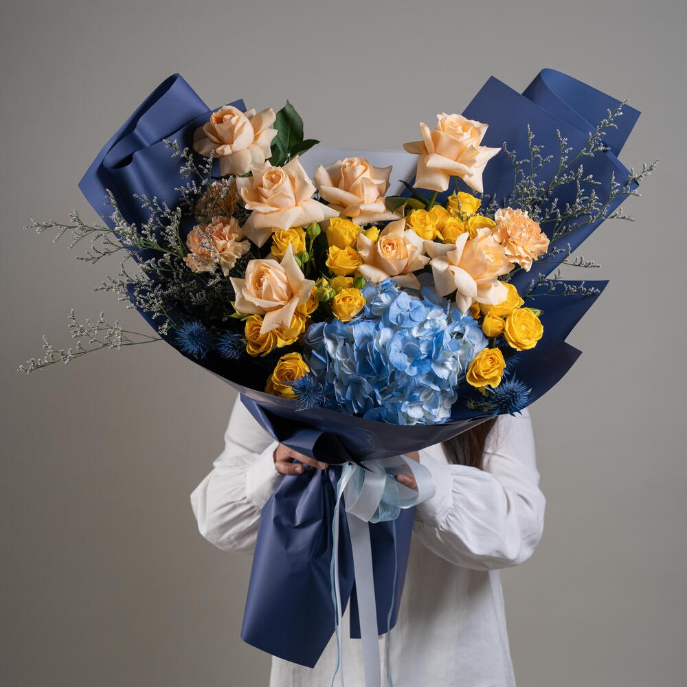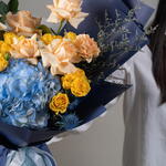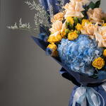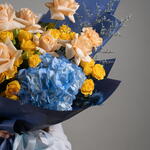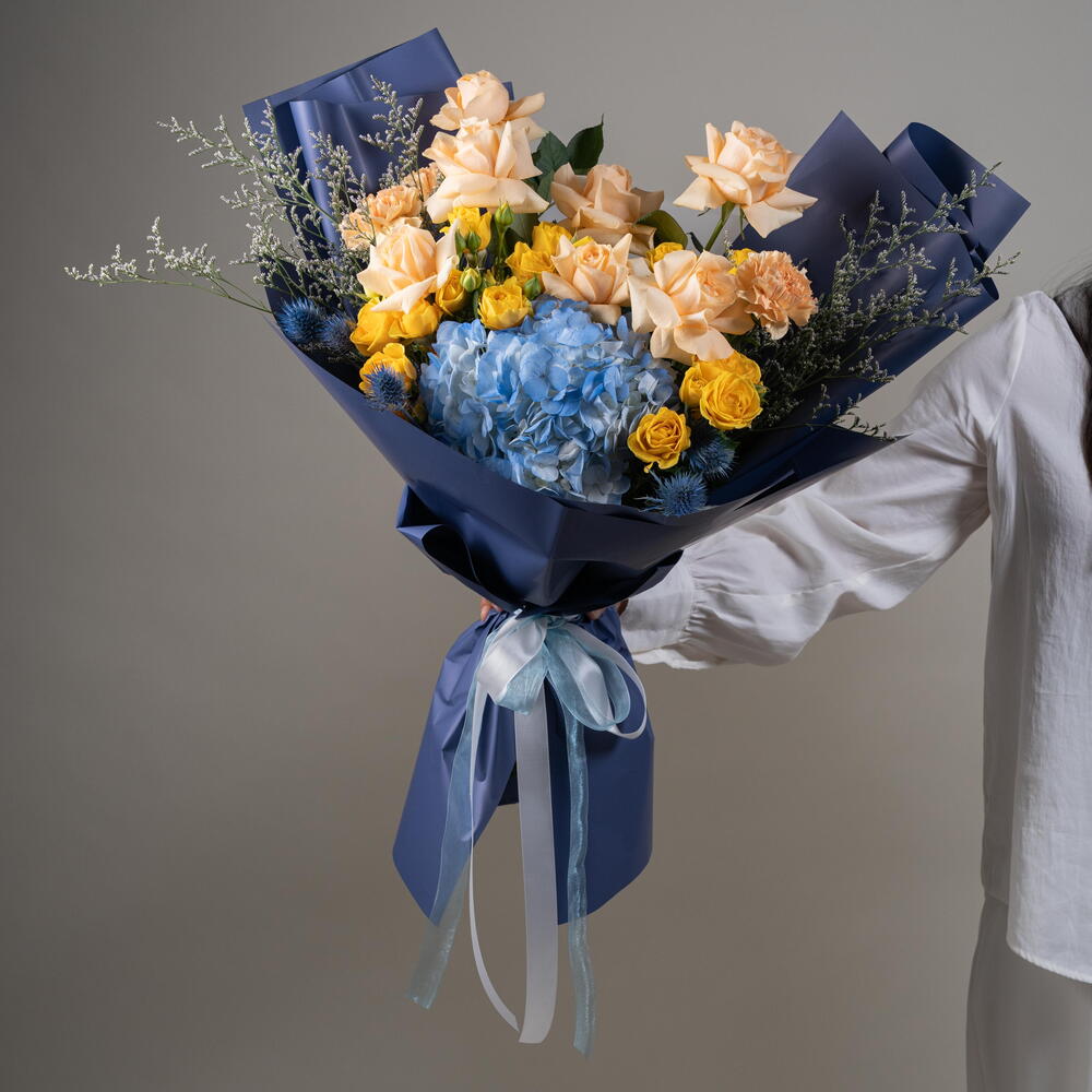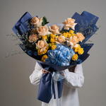 peach rose - 7 шт. hydrangea blue - 1 шт. eryngium blue - 3 шт. персиковая гвоздика - 3 шт. жёлтая кустовая роза - 5 шт. листья фисташки - 3 шт. лимониум - 2 шт.