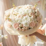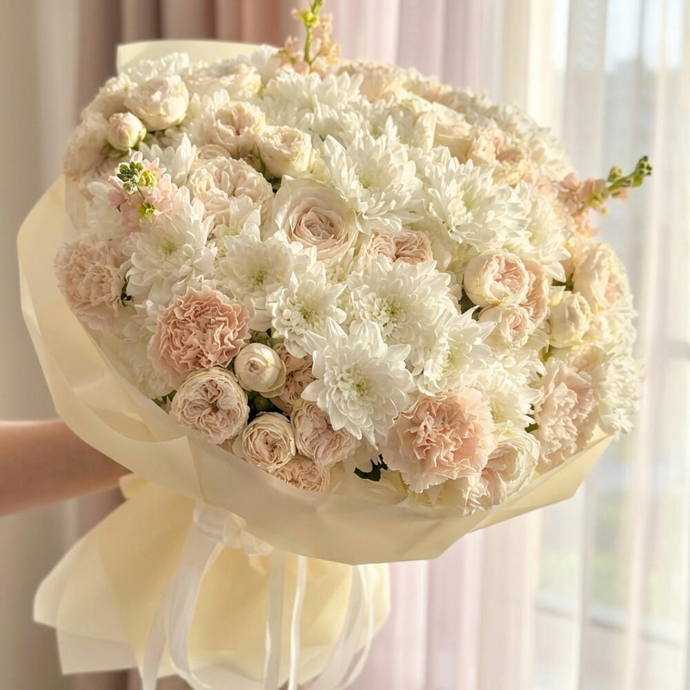 chrysanthemum spray white - 10 шт. Белая Охара - 10 шт. маттиола персиковая - 3 шт. гвоздики светло-розовые - 10 шт. бомбастичный светло-розовый - 10 шт.