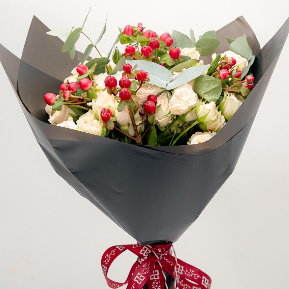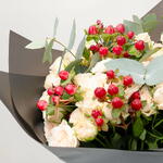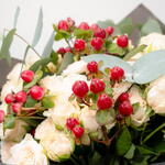 персиковая кустовая роза - 10 шт. гиперикум красный - 5 шт. зелёный эвкалипт - 5 шт.