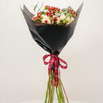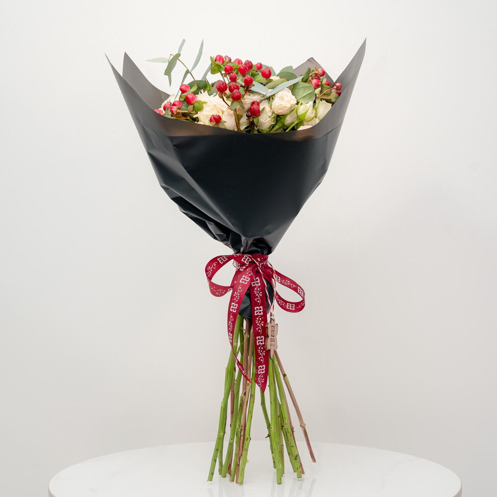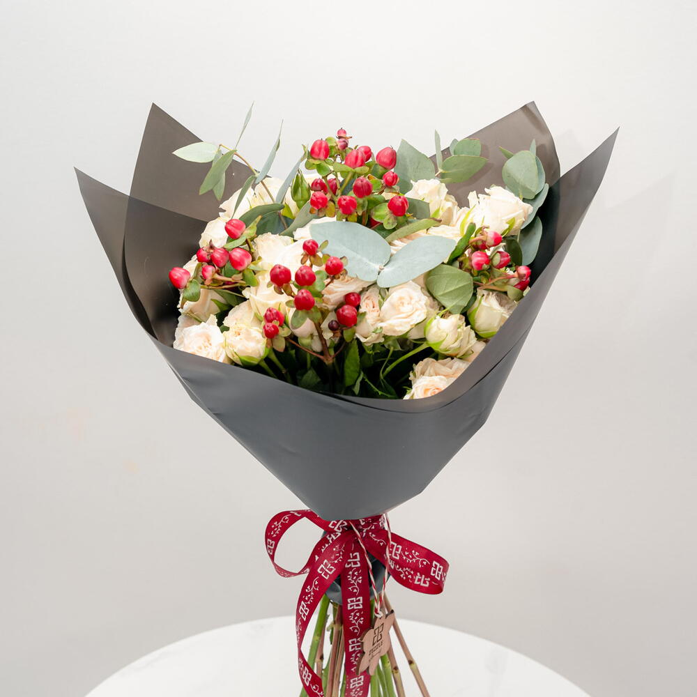 Яркий и жизнерадостный букет «Персиковый сюрприз» состоит из 10 нежных персиковых кустовых роз, 5 ярко-красных ягод гиперикума и 3 пышных зеленых листьев эвкалипта. Эта игривая композиция излучает радость и оптимизм, идеально подходя для празднования дня рождения, дружеского торжества или просто для того, чтобы поднять кому-то настроение. Нежный пастельный оттенок роз в сочетании с яркими красными ягодами и свежей зеленью листвы создает жизнерадостную и вдохновляющую композицию.