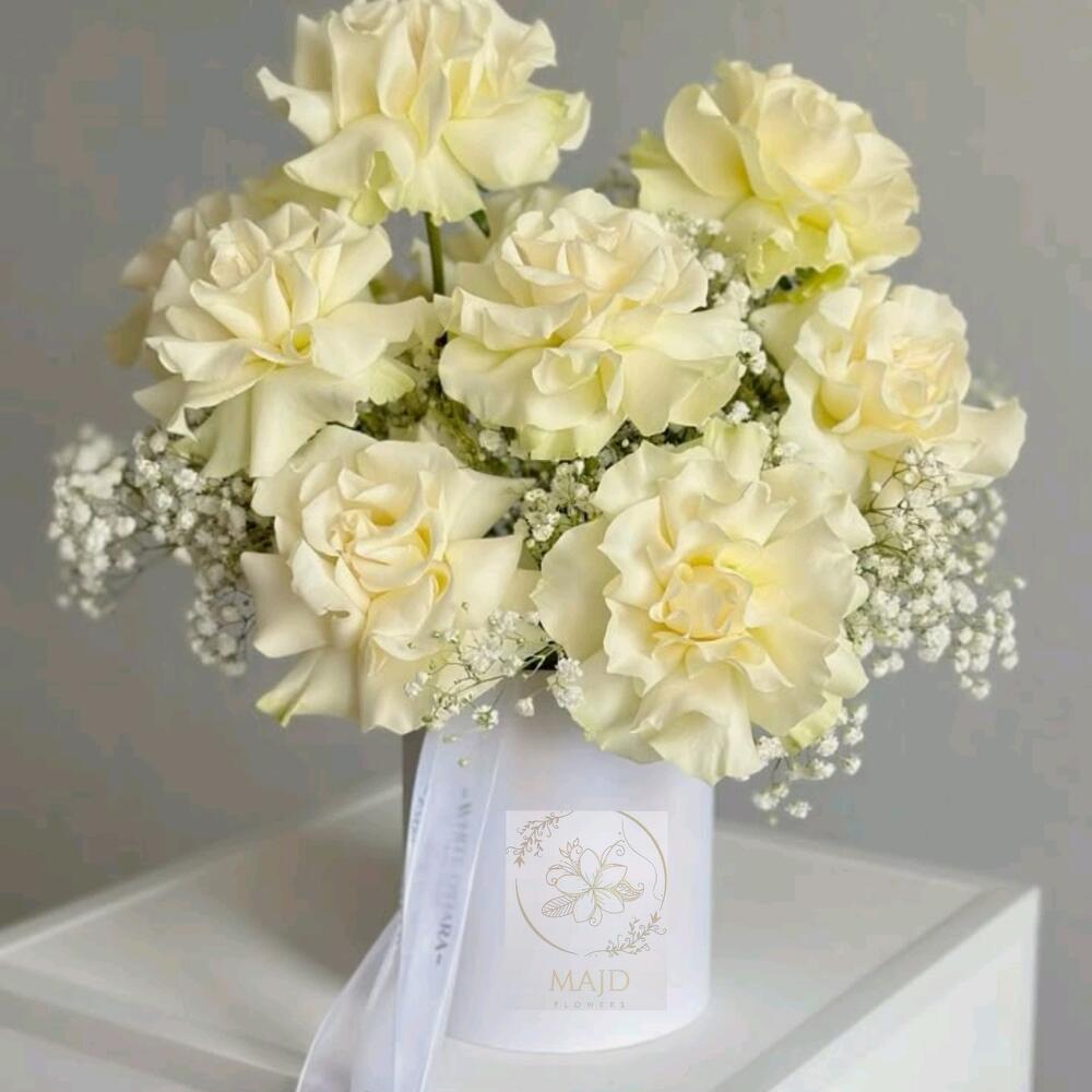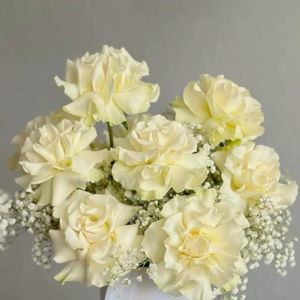 Белые розы сорта О’Хара, известные своими нежными кремовыми оттенками и роскошным ароматом, в сочетании с нежными облачками гипсофилы. Этот букет, оформленный в элегантную белую шляпную коробку, излучает чистоту, безмятежность и утонченное очарование. Он идеально подходит для выражения сочувствия, свадеб или торжества, прославляющего тихую силу и грацию.
