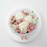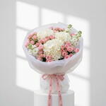 • A stunning architectural bouquet featuring a lush blend of premium white hydrangeas and delicate pink spray roses. • Artfully layered with fragrant white stock and finished in our signature white mesh cloud for an airy, voluminous silhouette. • An exquisite statement of modern luxury and grace, perfect for celebrating life’s most sophisticated moments. • Please Note: As flowers are natural products, actual colors may vary slightly from digital images due to seasonal growth and lighting conditions. We guarantee that the overall style and premium quality as well as freshness of your arrangement will always be maintained.