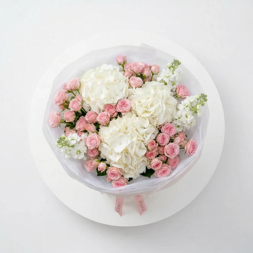 white hydrangea - 3 шт. white matthiola - 5 шт. розовые спрей-розы - 20 шт. роскошная белая сетчатая упаковка "облако" - 1 шт.