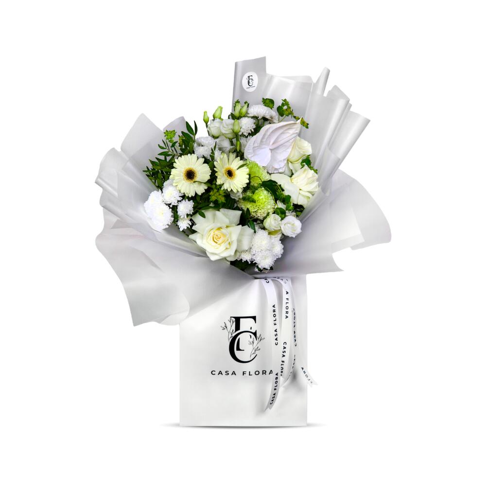 Изысканный букет, созданный с мыслью об элегантности. Включает свежие белые розы, герберы, хризантемы, лизиантусы и нотку антуриума, дополненные пышной зеленью. Представленная в фирменной сумке Casa Flora с матовой упаковкой, эта композиция символизирует чистоту, изящество и вневременную утонченность. Идеально подходит для свадеб, юбилеев, выражения сочувствия или любого повода, требующего нотки классической красоты.”