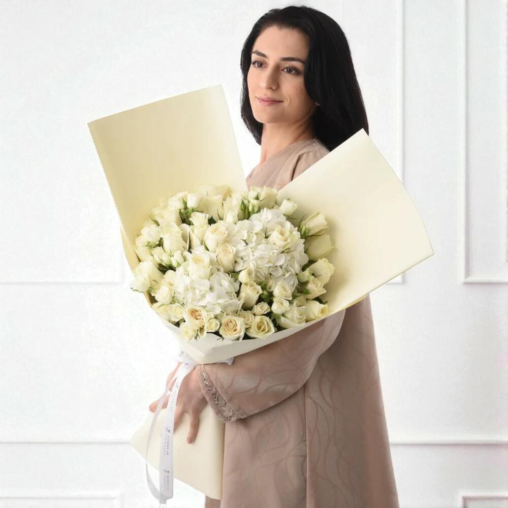 Отпразднуйте самые важные моменты жизни с букетом жемчужно-белых роз – захватывающей дух композицией, излучающей изящество, чистоту и элегантность. Этот букет ручной работы, состоящий из роскошного сочетания белоснежных роз, кустовых роз и пышных белых гортензий, станет лучшим выражением любви, восхищения и утонченной изысканности. Отмечаете ли вы день рождения, годовщину, помолвку или поздравляете кого-то, этот белоснежный цветочный шедевр произведет идеальное впечатление – непринужденно шикарный и бесконечно прекрасный. Инструкция по уходу Чтобы букет дольше оставался свежим, как можно скорее поместите его в чистую воду комнатной температуры. Перед тем, как поставить букет в вазу, обрежьте стебли на 1–2 см под углом 45°. Меняйте воду каждые 1–2 дня и держите букет вдали от прямых солнечных лучей, источников отопления и вентиляторов. Удалите увядшие цветы, чтобы сохранить красоту и свежесть остальных.