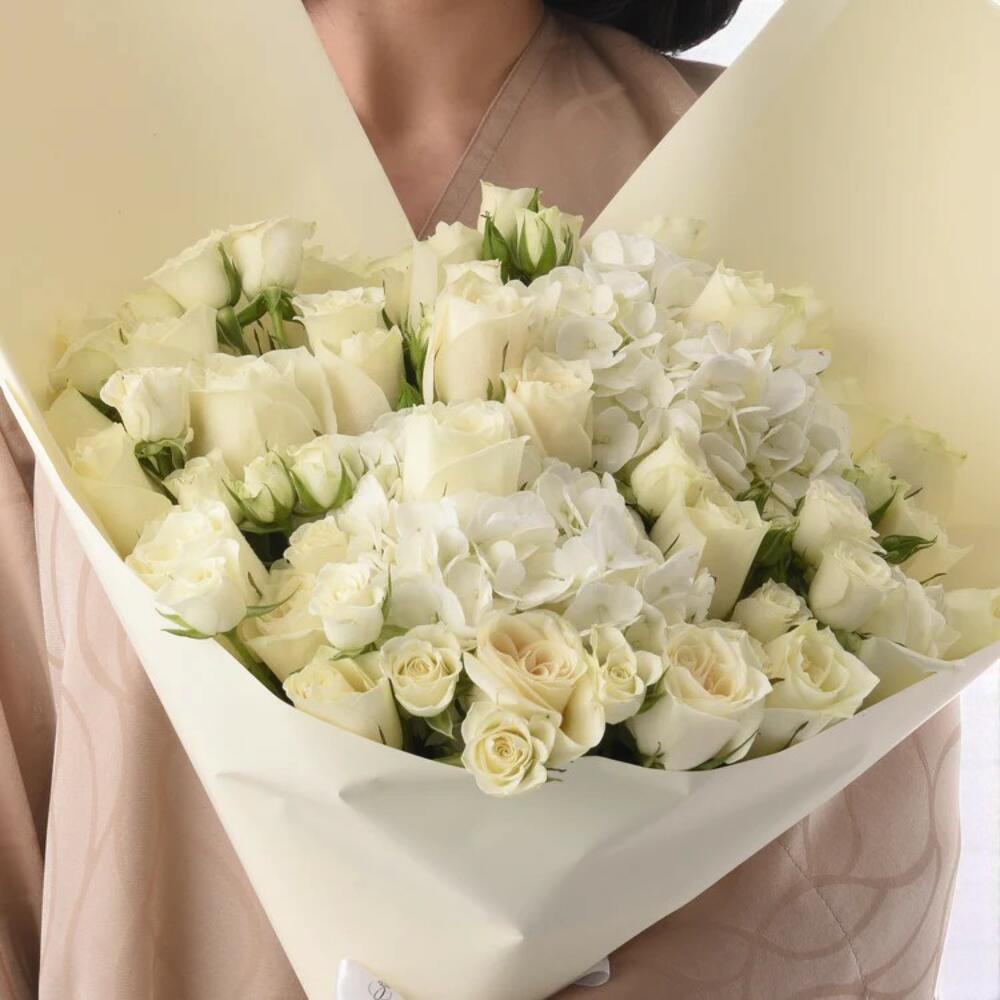 Жемчужно-белый букет из роз – элегантные белые розы композиция из гортензий