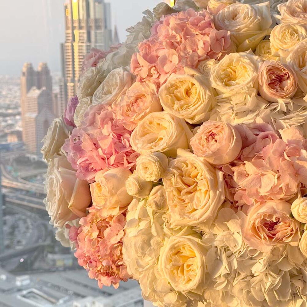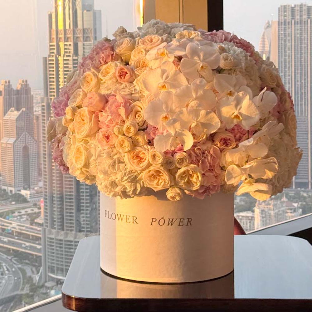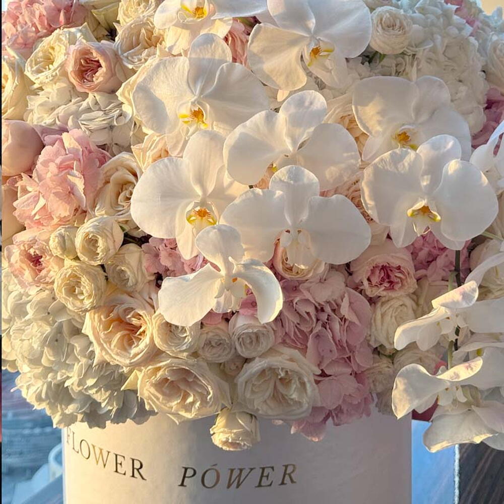 Потрясающе роскошная, сверхкрупная композиция с богатым сочетанием гортензий, классических роз и изящных орхидей фаленопсис. Представленная в стильной коробке, эта роскошная выразительная композиция передаёт чувство глубокого восхищения, великолепия и незабываемой радости. Это идеальный грандиозный жест для знаменательных событий, таких как крупные юбилеи, празднования успеха или когда вы хотите произвести по-настоящему впечатляющий эффект на день рождения.