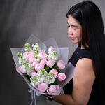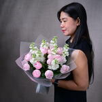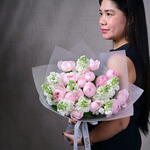 Потрясающая композиция, включающая 15 пионовидных роз и 9 стеблей маттиолы, соединяющая нежные романтичные оттенки пионовидных роз с элегантной текстурой маттиолы, букет, излучающий красоту и утонченность, идеальный для свадеб, годовщин или любого особого случая, создан с заботой и доставляется свежим из Fellora Flower Boutique.