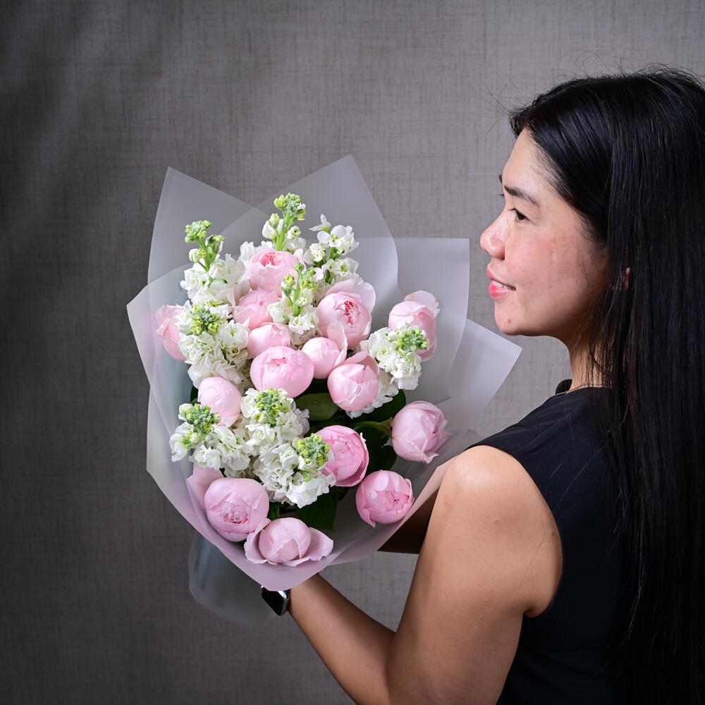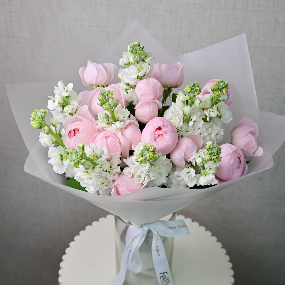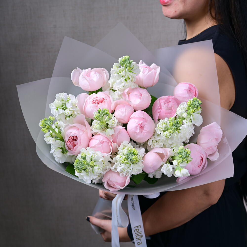 Потрясающая композиция, включающая 15 пионовидных роз и 9 стеблей маттиолы, соединяющая нежные романтичные оттенки пионовидных роз с элегантной текстурой маттиолы, букет, излучающий красоту и утонченность, идеальный для свадеб, годовщин или любого особого случая, создан с заботой и доставляется свежим из Fellora Flower Boutique.
