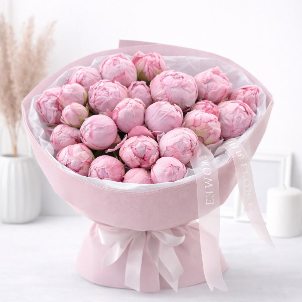 Описание: 30 розовых пионов Премиальная розовая упаковка с белой тишью Отделка фирменной лентой