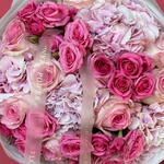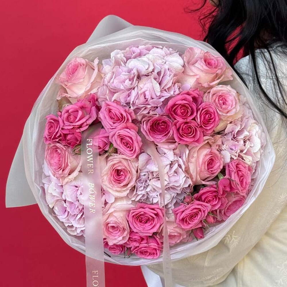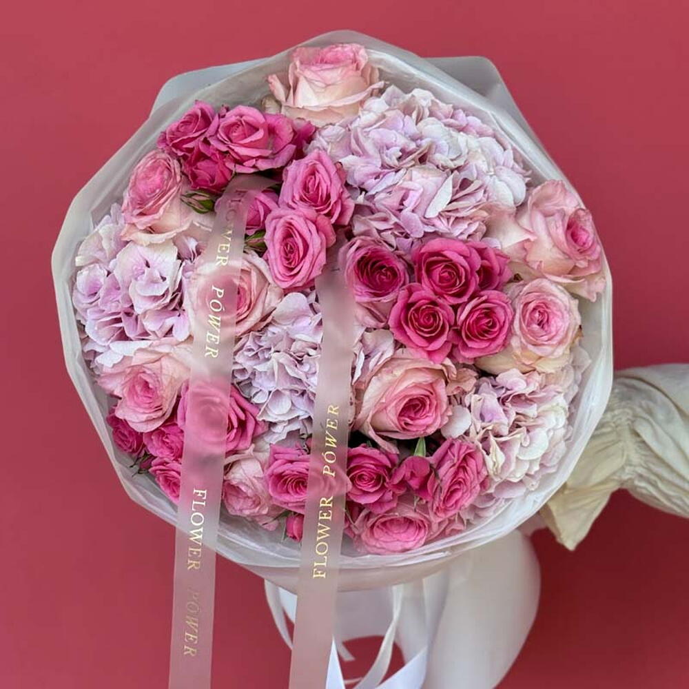 гортензия светло-розовая - 4 шт. кустовая роза фуксия - 4 шт. садовая роза светло-розовая - 7 шт.
