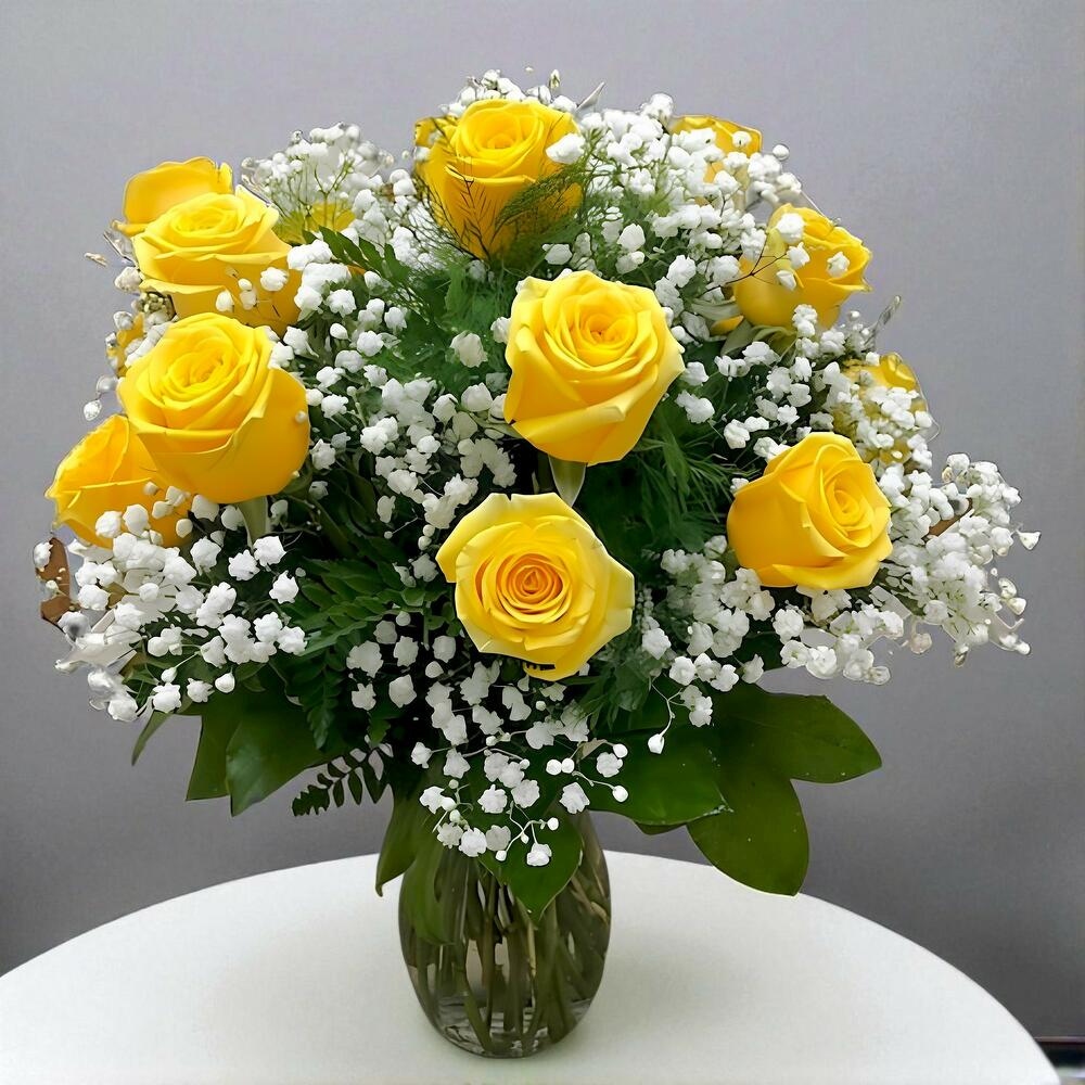 gypsophila white - 10 шт. желтые розы - 15 шт. прозрачная ваза - 1 шт.