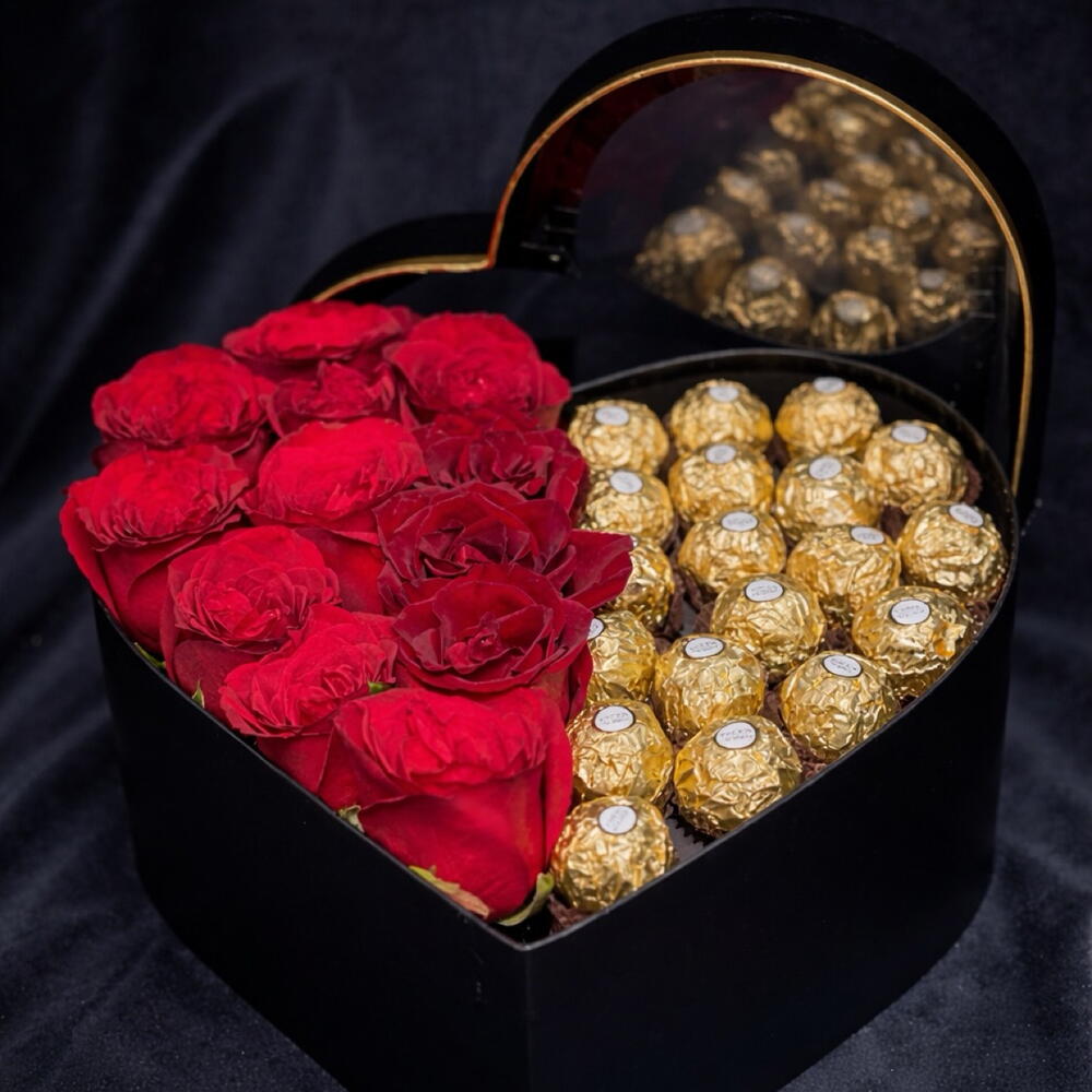 Побалуйте себя элегантностью этого изысканного букета, который гармонично сочетает очарование 12 ярких красных роз с декадентской роскошью 12 шоколадных конфет Ferrero Rocher. Всё уложено в элегантную чёрную коробку в форме сердца. Этот букет шоколадных цветов наверняка украсит любое особое событие. Выразите свою привязанность этим сладким и впечатляющим подарком, идеально подходящим взыскательному любителю шоколада и поклоннику романтики.