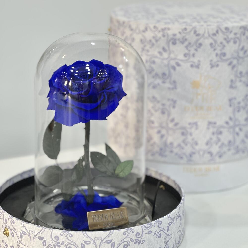 Эта яркая и изысканная 20-сантиметровая синяя роза «Бесконечность» бережно хранится долгие годы. Заключённая в прозрачный стеклянный купол и установленная на подставку с металлической пластиной, выгравированной на логотипе нашего цветочного магазина, она излучает элегантность. Упакованная в подарочную коробку с логотипом, перевязанную кожаным ремешком, она станет уникальным и долговечным символом верности, доверия и спокойствия.