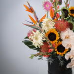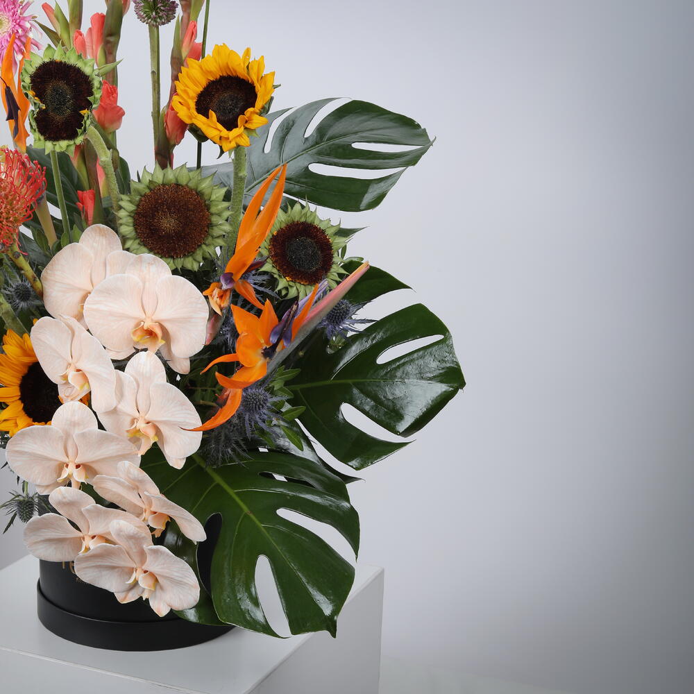 Phalaenopsis - 1 шт. Pistachio - 3 шт. monstera - 5 шт. sunflowers - 8 шт. black box - 1 шт. gladiolus - 5 шт. leucospermum - 3 шт. eryngium - 5 шт. allium - 2 шт. райская птица - 5 шт. гербера баста - 3 шт.