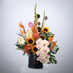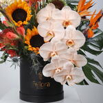 Почувствуйте высочайшее мастерство цветочного искусства с премиальной цветочной коробкой «Фаленопсис». Эта роскошная композиция включает в себя яркие экзотические цветы: величественную «Райскую птицу», сияющие подсолнухи, яркие герберы, эффектные гладиолусы, яркий леукоспермум и очаровательные орхидеи фаленопсис. Нежные аллиумы, синегнойник и свежая тропическая зелень, такая как листья монстеры и фисташки, придают композиции текстуру и глубину. Всё это красиво оформлено в элегантной чёрной коробке для современной и роскошной презентации. Эта цветочная коробка станет идеальным подарком для торжественных случаев, сердечных жестов или изысканного декора — она воплощает элегантность, цвет и тропическую изысканность. Мы осуществляем доставку по Дубаю, Шардже и Аджману, доставляя красоту наших цветочных творений прямо к вашему порогу.