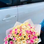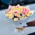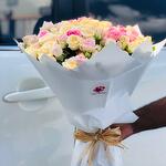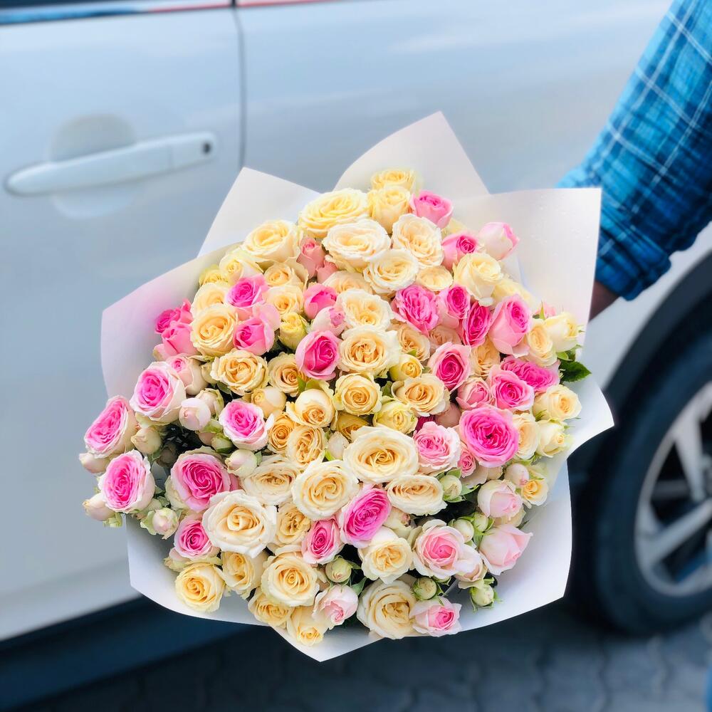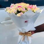 Красивый букет с миксом из 20 стеблей розовых и 20 стеблей персиковых спрей-роз (100+ цветов) в белой упаковке
