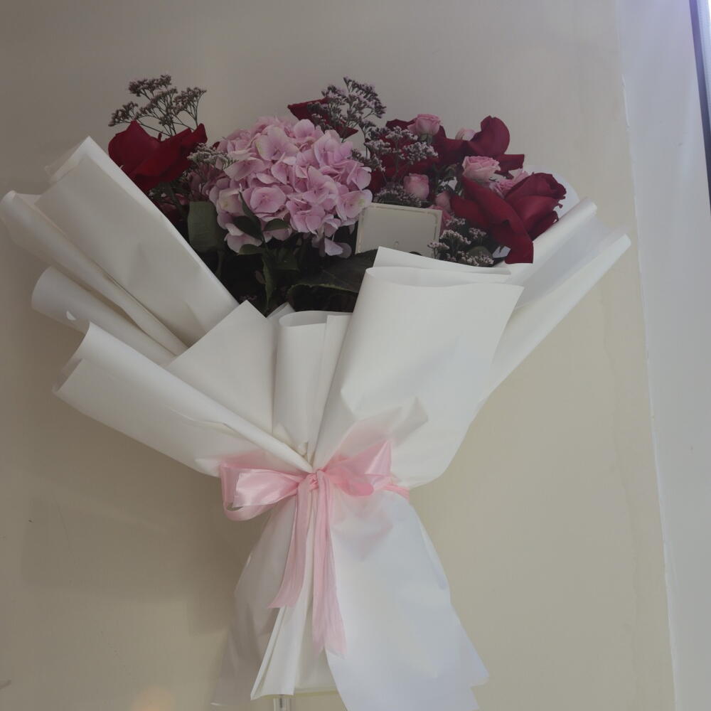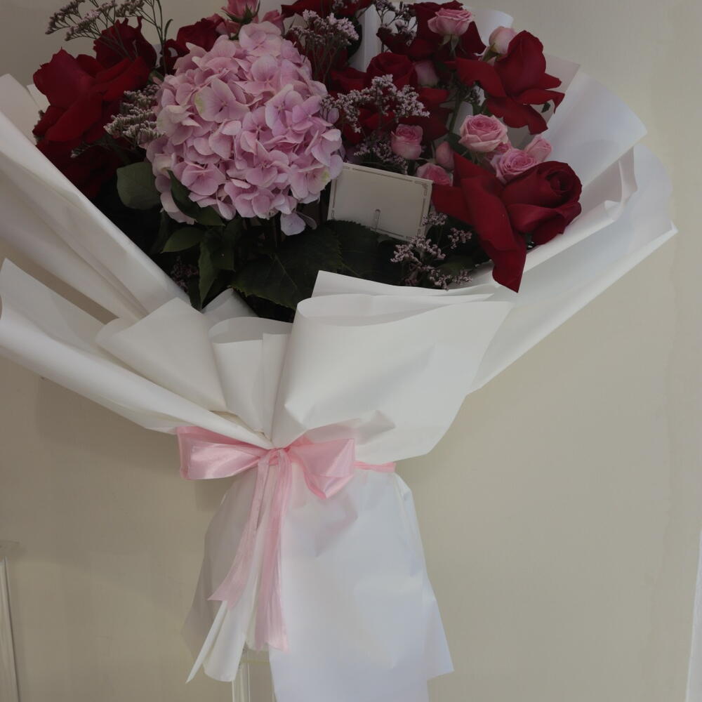 Этот тщательно подобранный букет представляет собой потрясающее сочетание роз: 8 романтичных красных роз, 4 нежные розы, 1 уникальная гортензия и 4 розовых лимониума. Он был продуман до мелочей, чтобы добавить красоты и элегантности любому случаю. Его яркие и пленительные цвета делают его прекрасным выбором для выражения ваших чувств.