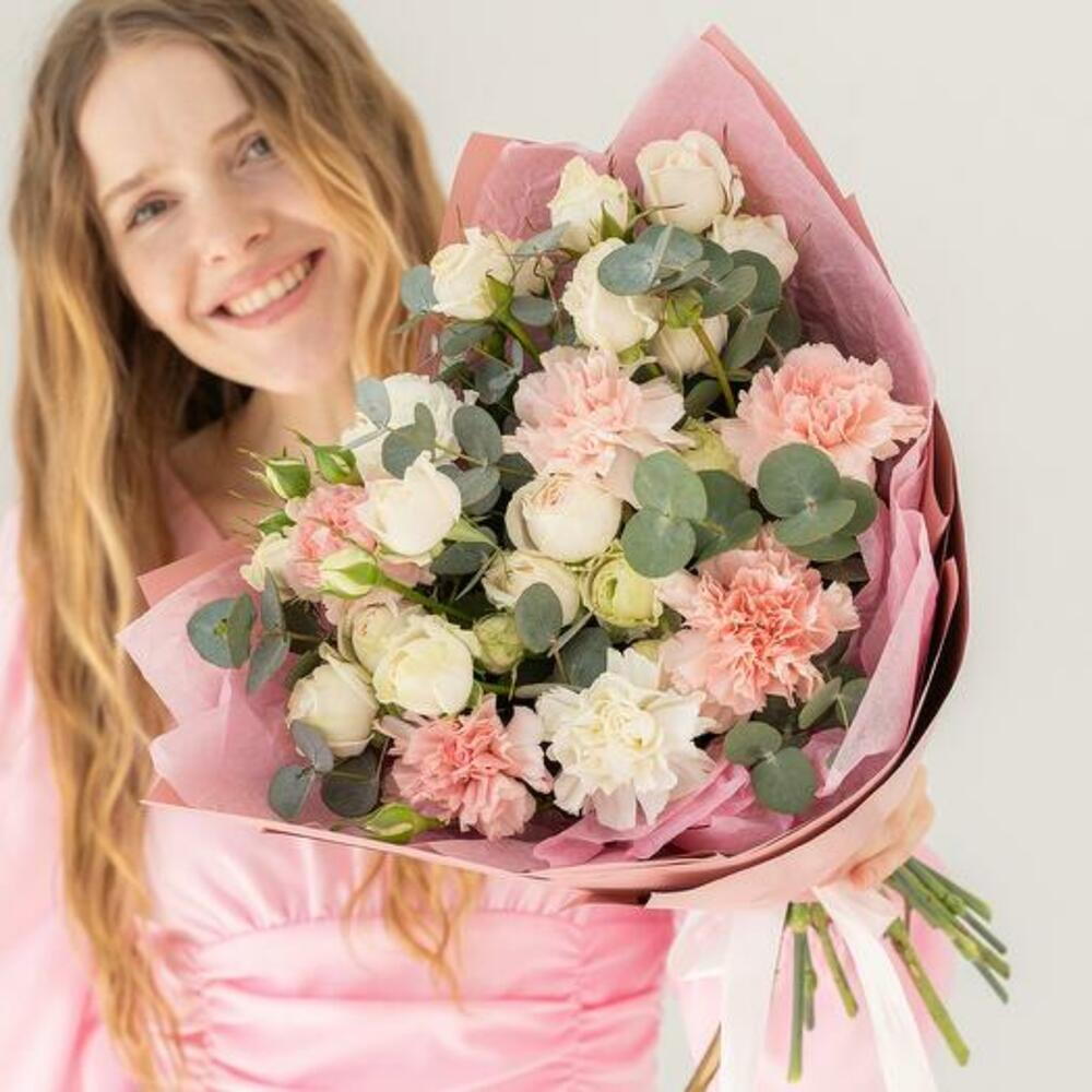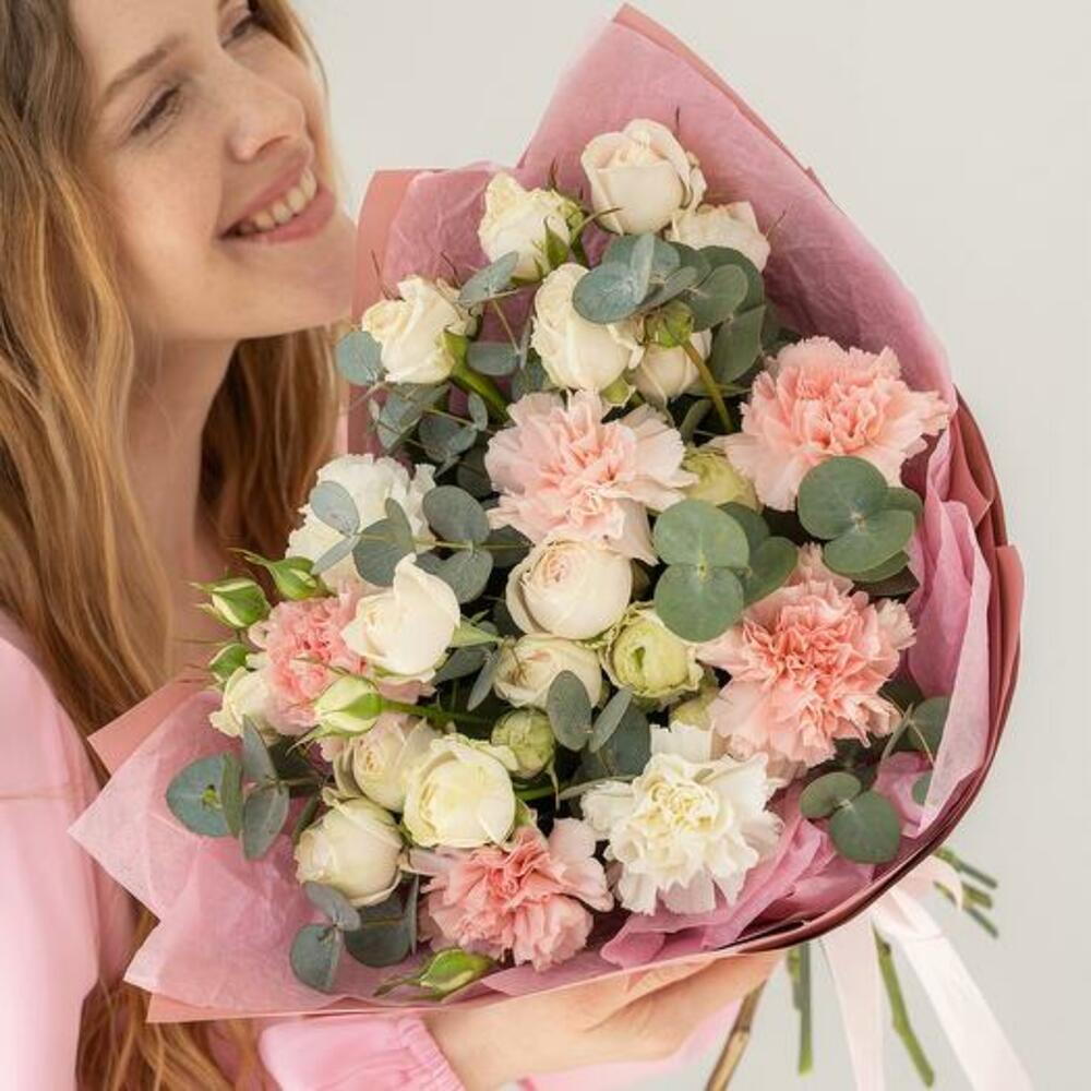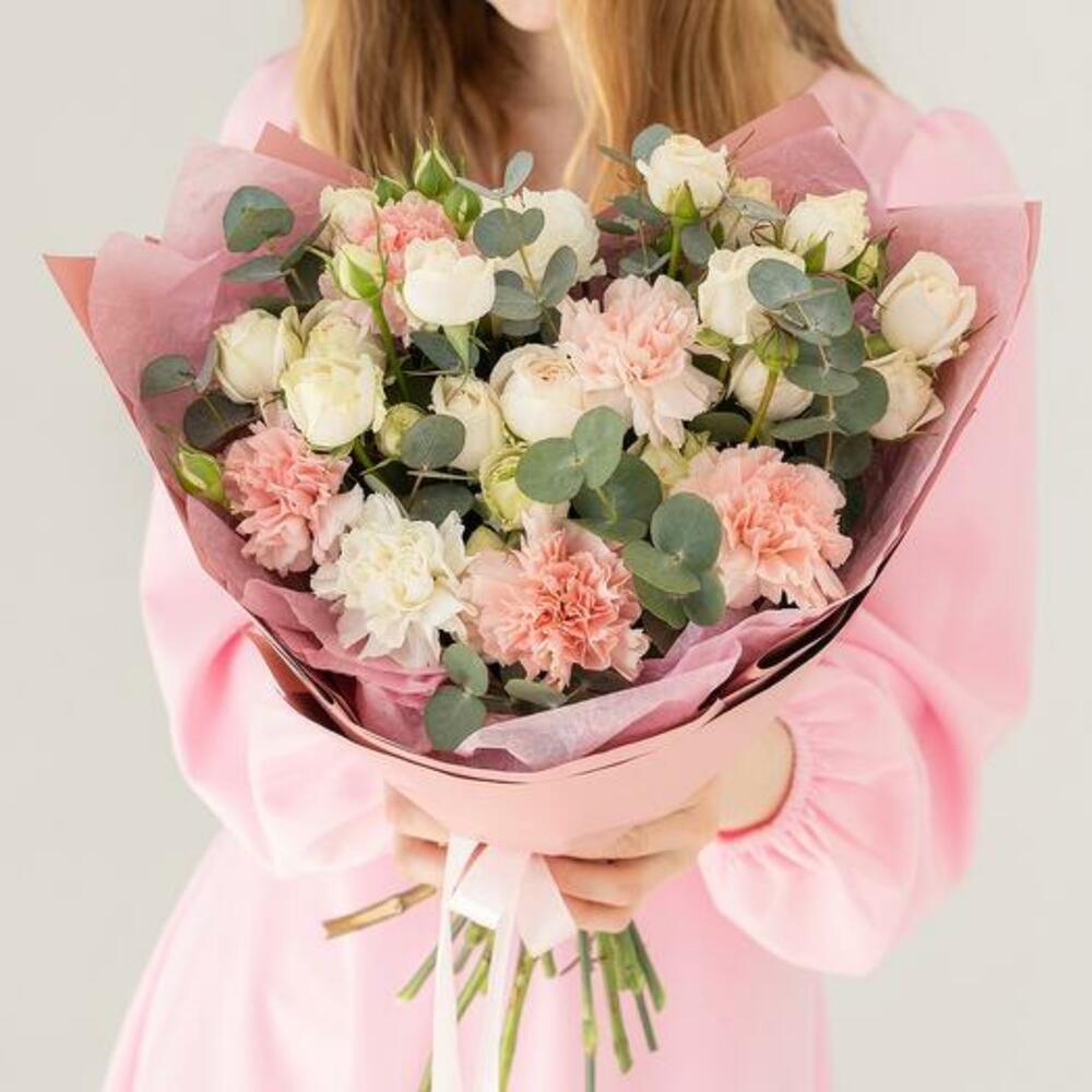 Satin ribbon - 1 шт. Eucalyptus - 3 шт. white spray rose - 3 шт. pink carnation - 5 шт. дизайн упаковки - 1 шт. белый гвоздика - 2 шт.