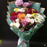 Это яркий смешанный букет, завернутый в бирюзовую бумагу с белой лентой. В букете, по-видимому, присутствуют различные цветы, такие как розы, хризантемы и, возможно, георгины, в различных оттенках, включая красный, оранжевый, белый, розовый и жёлтый. Он оформлен в округлой форме, что является популярным выбором для букетов.