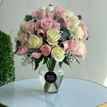 Насладитесь гармоничным сочетанием элегантности и очарования с нашей чарующей композицией из 25 роз в розовых и белых тонах, искусно собранных в прозрачной стеклянной вазе.