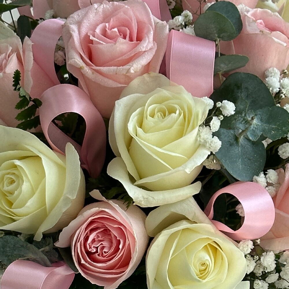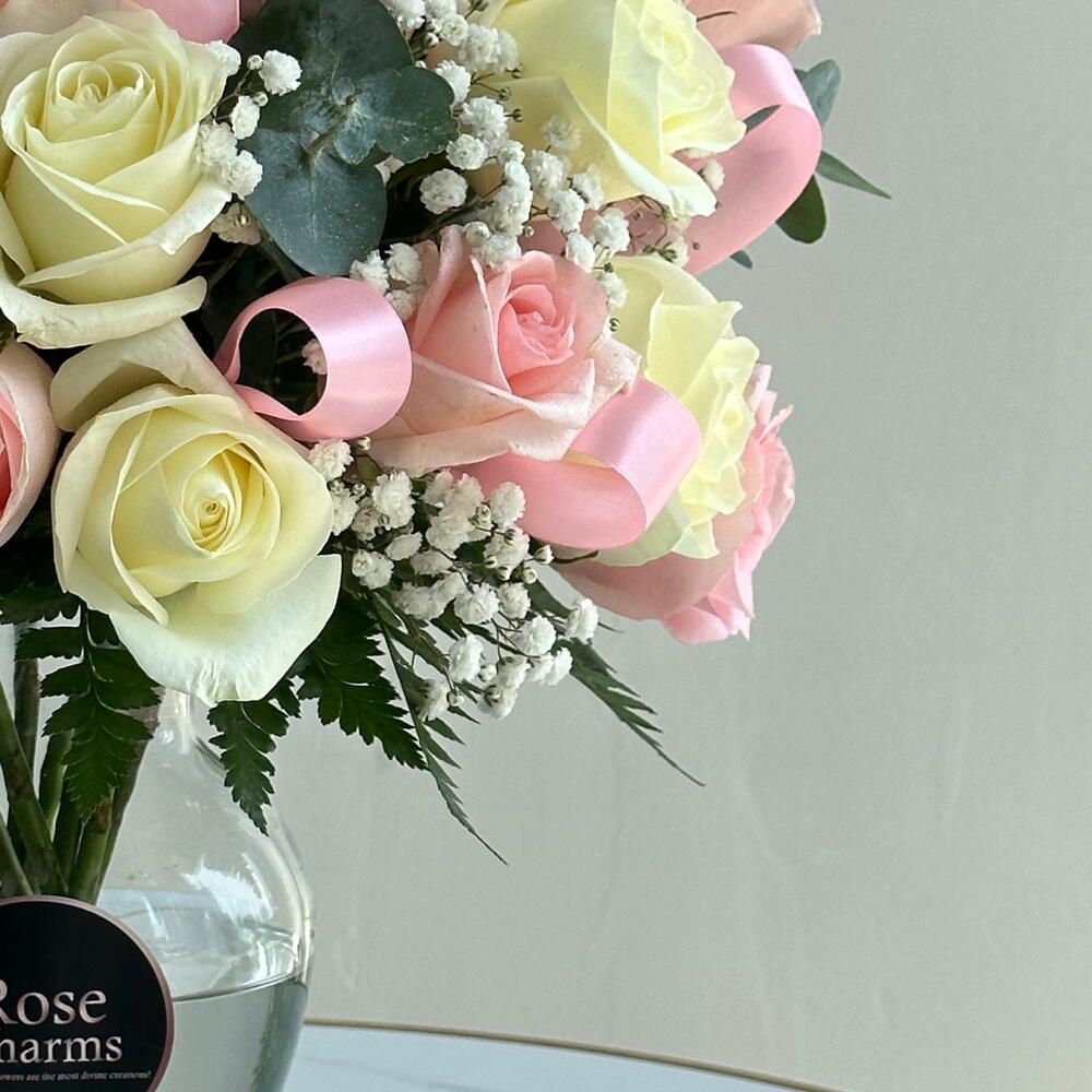 Насладитесь гармоничным сочетанием элегантности и очарования с нашей чарующей композицией из 25 роз в розовых и белых тонах, искусно собранных в прозрачной стеклянной вазе.