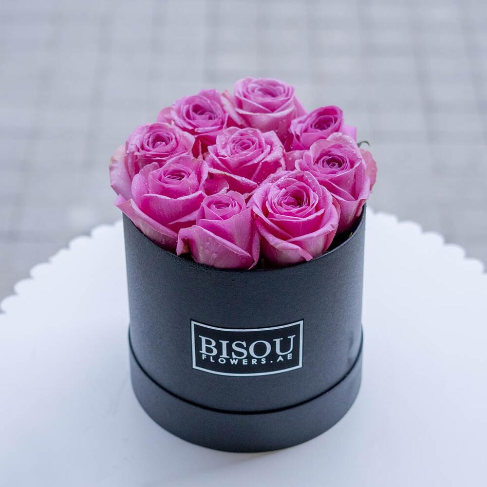 Композиция из 9 стеблей тёмно-розовых роз в чёрной коробке