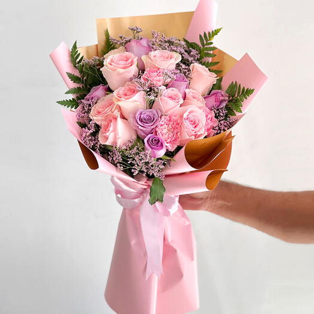 Unveil your emotions with this stunning Mono Bouquet meticulously crafted with 8 blushing pink roses, 6 majestic purple roses, 3 gentle pink carnations, 5 sprays of delicate Pink Limonium, all thoughtfully framed with 3 lush Leatherfern leaves. This radiant mix of romantic hues is perfect for expressing affection and appreciation that captivates at the very first glance. This bouquet is an ideal dash of elegance for any special occasion or just to brighten up someones ordinary day. Let this heartfelt floral arrangement speak volumes about your sentiments.