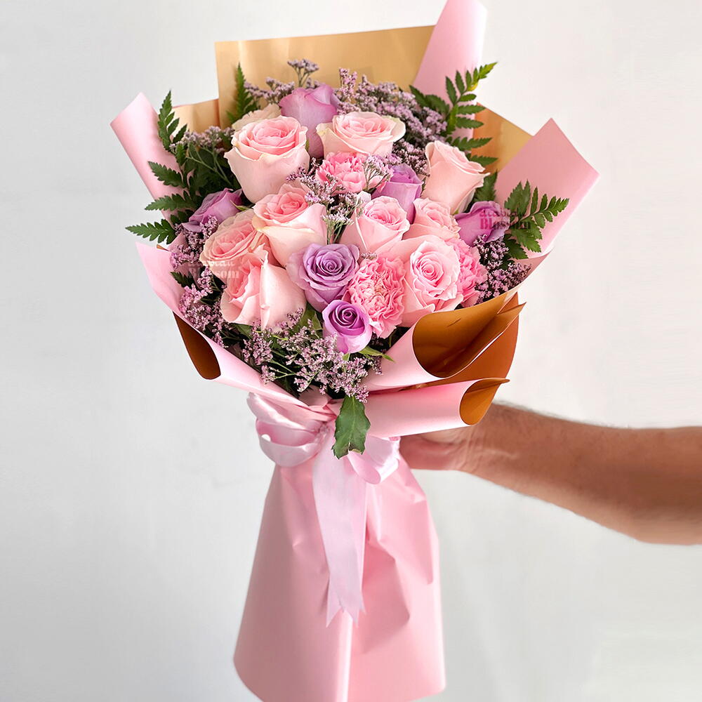 Bouquet of 8 pink rose, 6 purple rose, 3 pink carnation with fillers in a nice wrapping. Beautiful bouquet of 8 pink roses, 6 purple roses, and 3 pink carnations with delicate fillers in elegant wrapping. A charming mix of romance and grace, perfect for birthdays, anniversaries, or heartfelt surprises. mixed rose bouquet, pink and purple roses, carnation bouquet, elegant flower arrangement, fresh flower delivery. Trim stems, place in fresh water, and keep away from direct sunlight and heat. Change water daily and remove wilted flowers to maintain freshness.