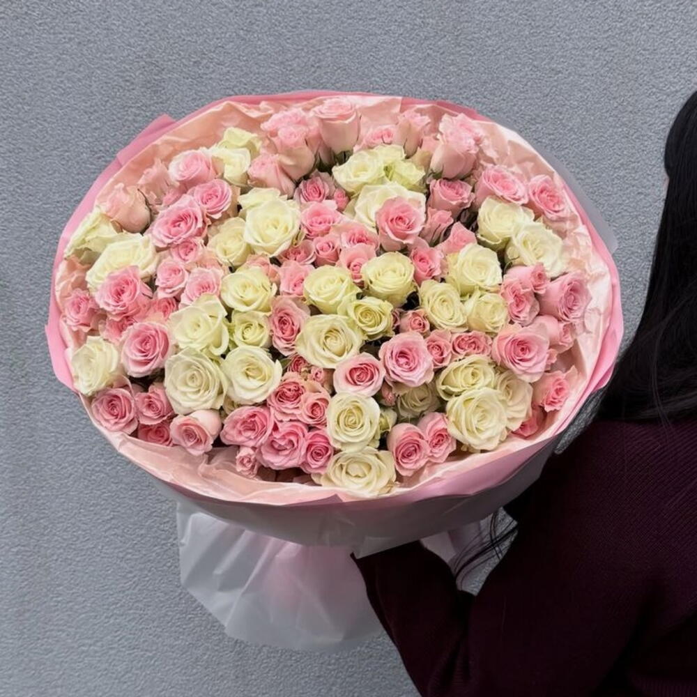 50 шт розовых роз 51 шт белых роз Букет из свежих нежно-розовых и белых роз 101, розовая круглая упаковка ручной работы...