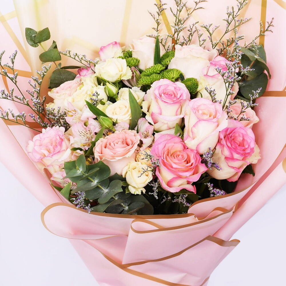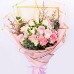 Откройте для себя флористическое волшебство с нашим специальным букетом Florists Special, составленным из отобранных вручную цветов для завораживающего впечатления. Эта пленительная композиция включает 2 стебля нежного лимониума, известного своими кружевными звездообразными цветками, создавая эфирную основу для аранжировки. В центре — 15 прекрасных роз нежно-розового цвета, выражающих глубокие чувства любви и восхищения. Также в букете 3 очаровательные мини-розы персикового оттенка, добавляющие тонкую нотку изящества, и 2 стебля зелёного бартона, служащие пышным фоном для элегантных цветов. Этот букет сочетает в себе женственные оттенки и насыщенную зелень, делая его идеальным подарком для любого повода.