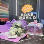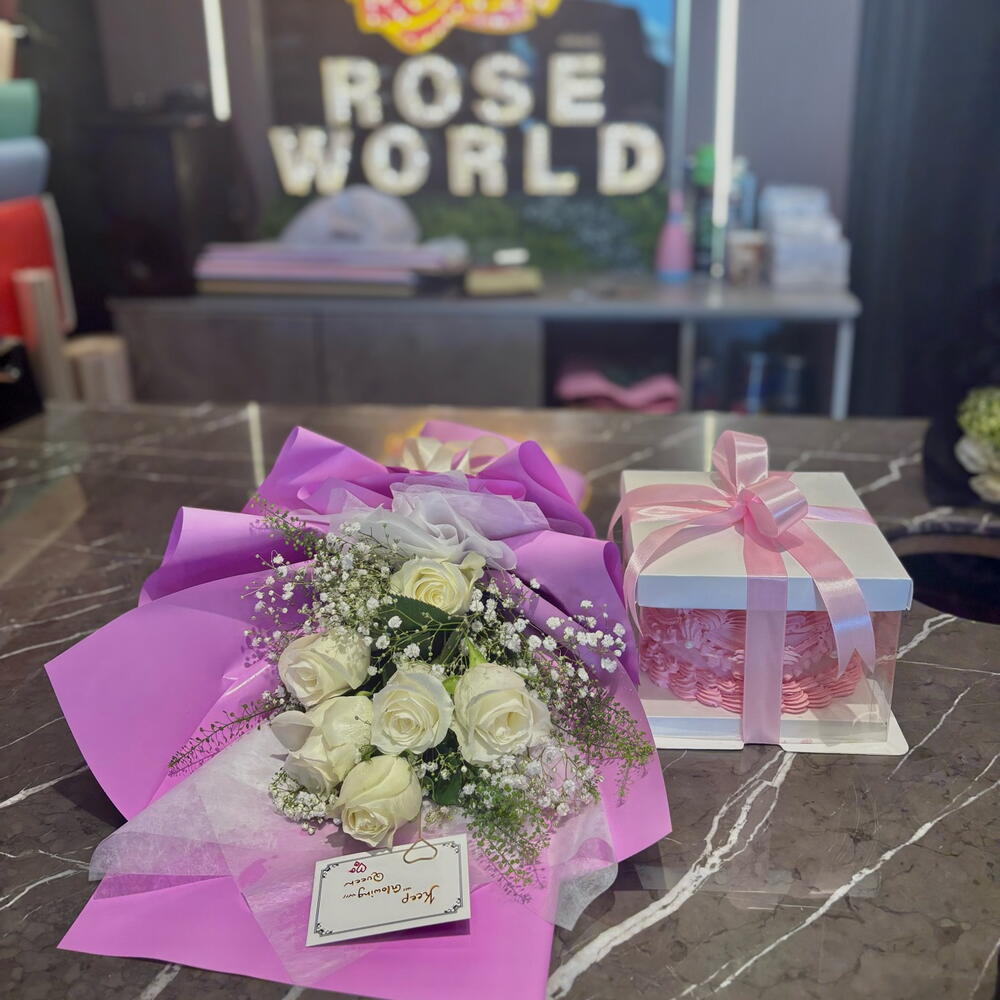 Элегантный подарочный набор: свежий букет нежно-розовых роз, завернутый с любовью, и красиво упакованный торт — идеальная пара, чтобы сделать любое торжество ещё более особенным! 🎂🌹✨