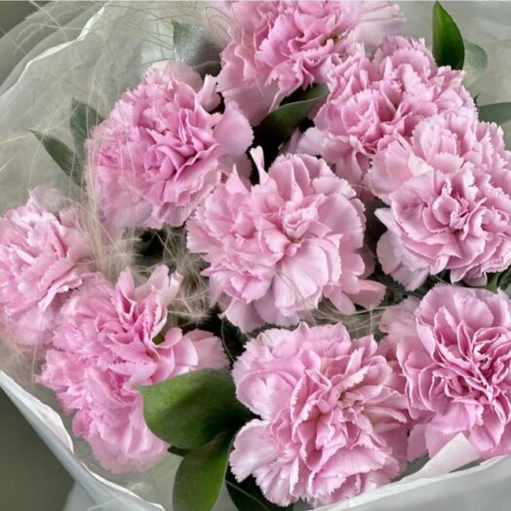 светло-розовая гвоздика - 10 шт. белая упаковочная бумага - 4 шт.