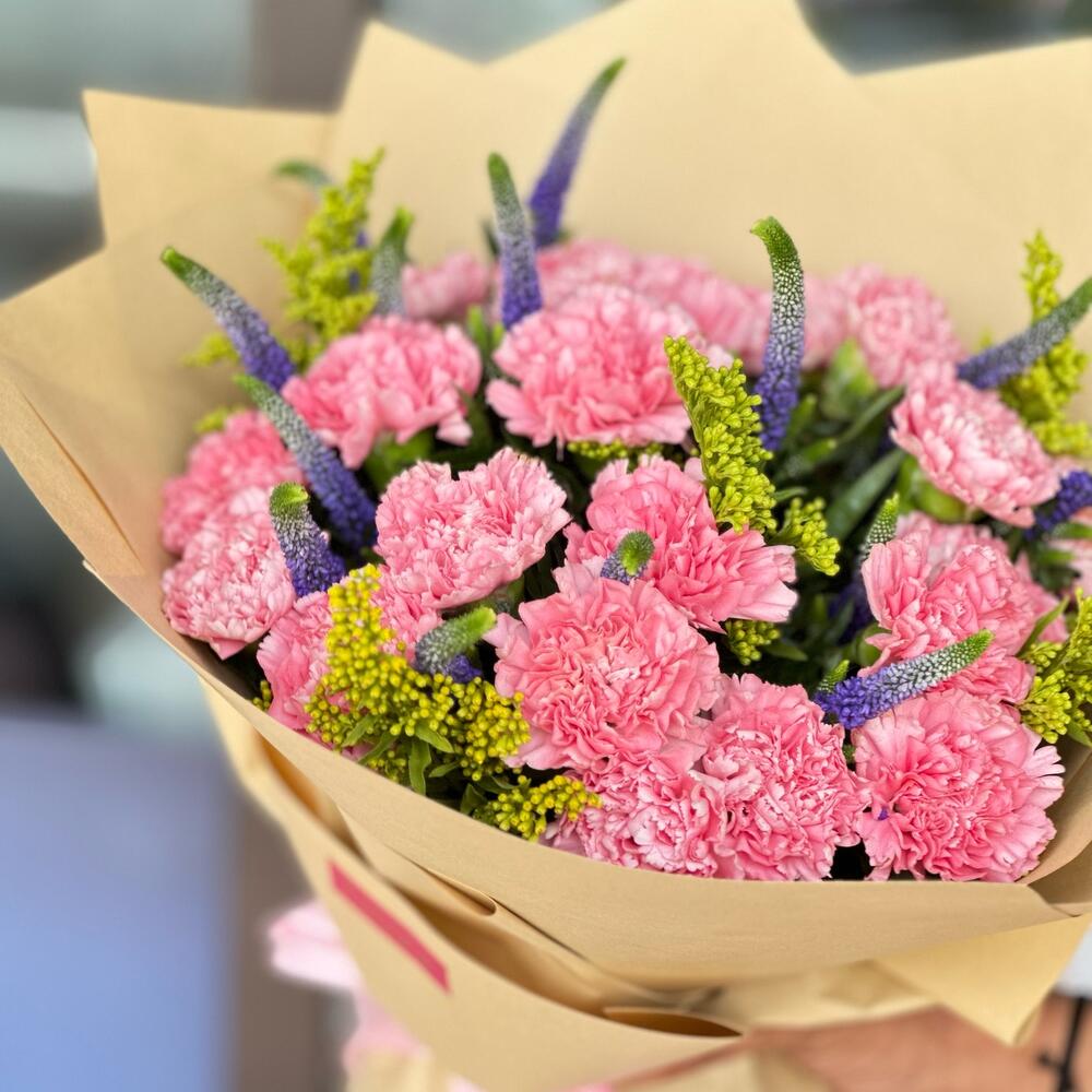 Solidago - 5 шт. Pink ribbon - 1 шт. pink carnation - 15 шт. фиолетовая вероника - 15 шт. коричневая упаковка - 2 шт.