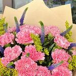 Букет из розовых гвоздик с фиолетовой вероникой и солидаго в качестве наполнителей. Завёрнут в коричневую бумажную обёртку и перевязан розовой лентой