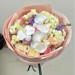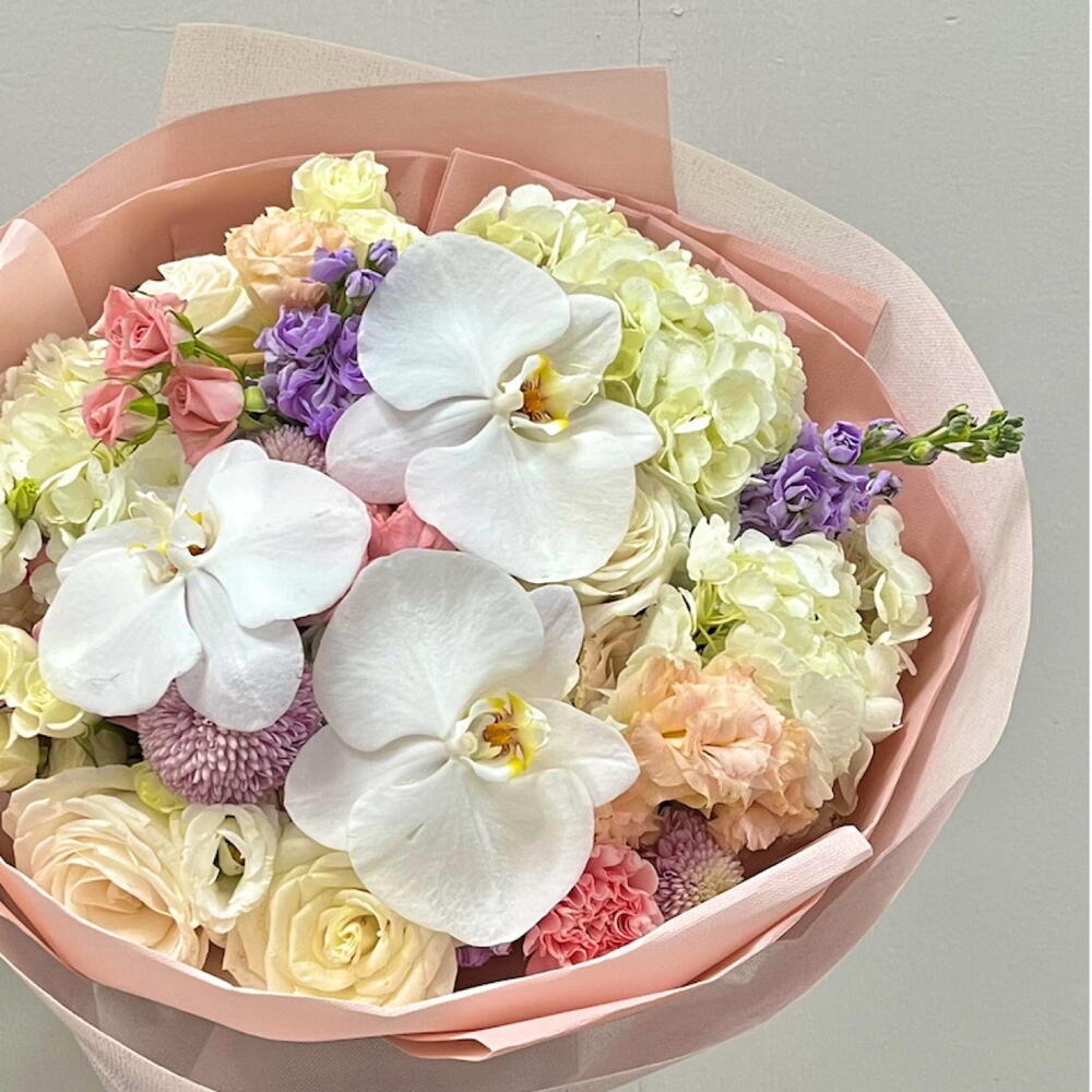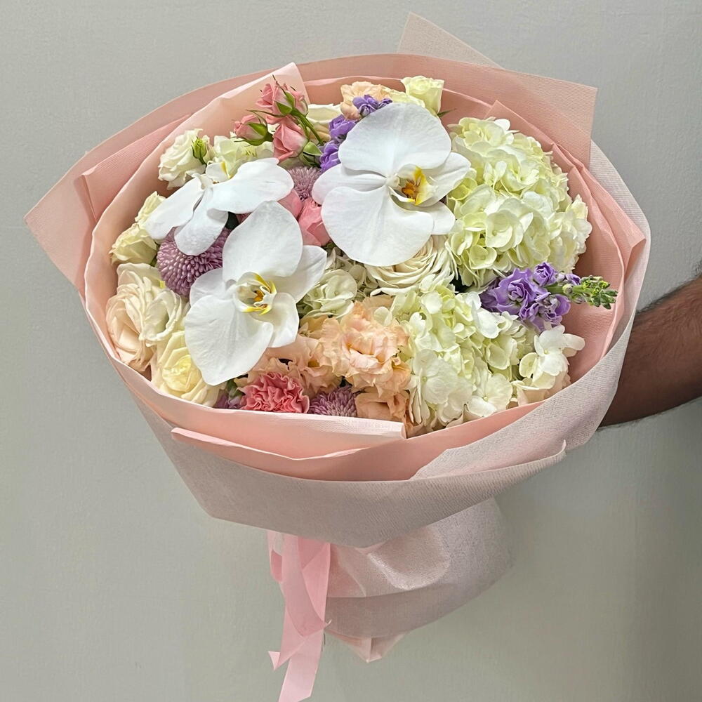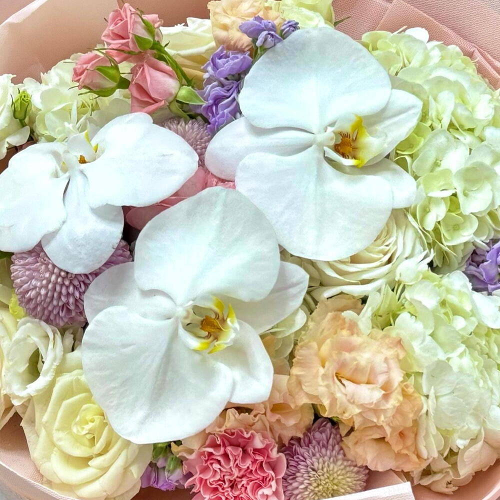 Изысканно роскошный выразительный букет, в центре — великолепные белые орхидеи, окружённые нежно-розовыми гвоздиками, кремовыми розами и пышной белой гортензией. Элегантно упакован в мягкую пастельную бумагу для потрясающей презентации свежих цветов. 💖 🤩 Идеально подходит для годовщин, Дня матери, пожеланий скорейшего выздоровления или как изысканный поздравительный подарок.
