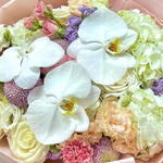White rose - 6 шт. Orchid - 3 шт. carnation pink - 4 шт. hydrangea white - 4 шт. spray rose white - 4 шт. spray rose pink - 3 шт. фиолетовая маттиола - 3 шт. лизиантус персиковый - 3 шт. хризантема пинг понг - 2 шт.