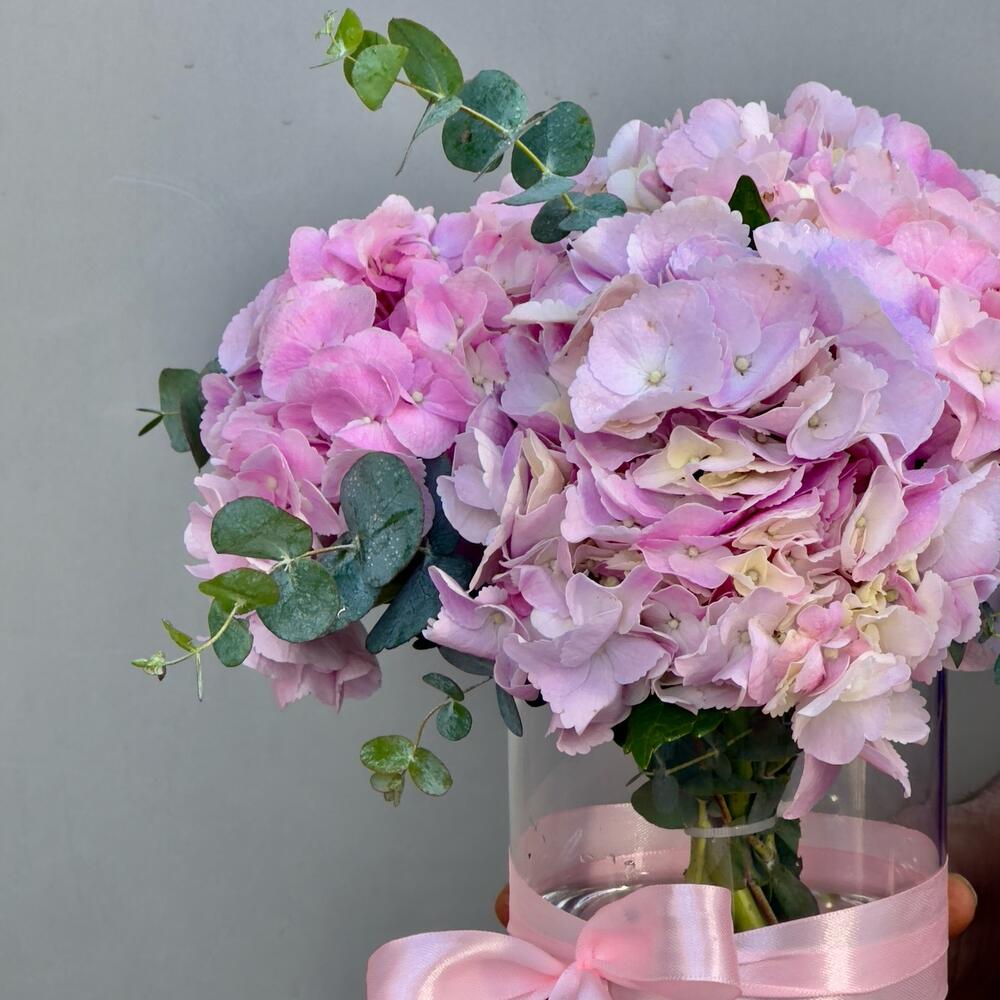 Ribbon - 1 шт. glass vase - 1 шт. pink hydrangea - 4 шт.